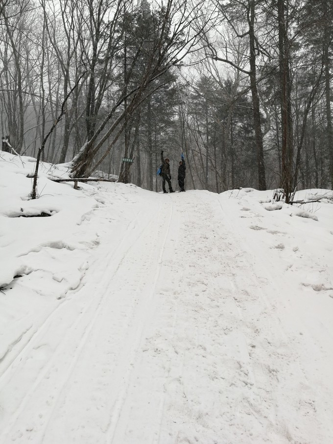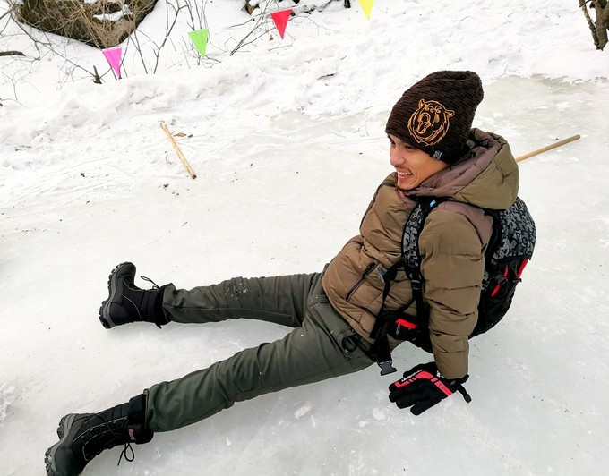 已经开始要借助木棍上坡了,后来的坡度更陡,只能手脚并用地往上爬。在一个陡坡处,我们遇到了一位爸爸带着一双儿女,路面结冰严重,儿子连摔了好几跤都上不去,最后硬是攀着路边的树枝才勉强上去。其实我们的情况也好不到哪里。