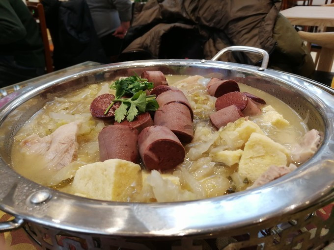 玩了接近两个小时,感觉有些冷了,就返回了客栈。晚饭依旧是在祥兰姐家吃的,小鸡炖蘑菇,酸菜炒土豆,叨爸还喝了点他家自己酿的粮食酒。蘑菇很好吃,鸡肉倒是稍微老了一点。