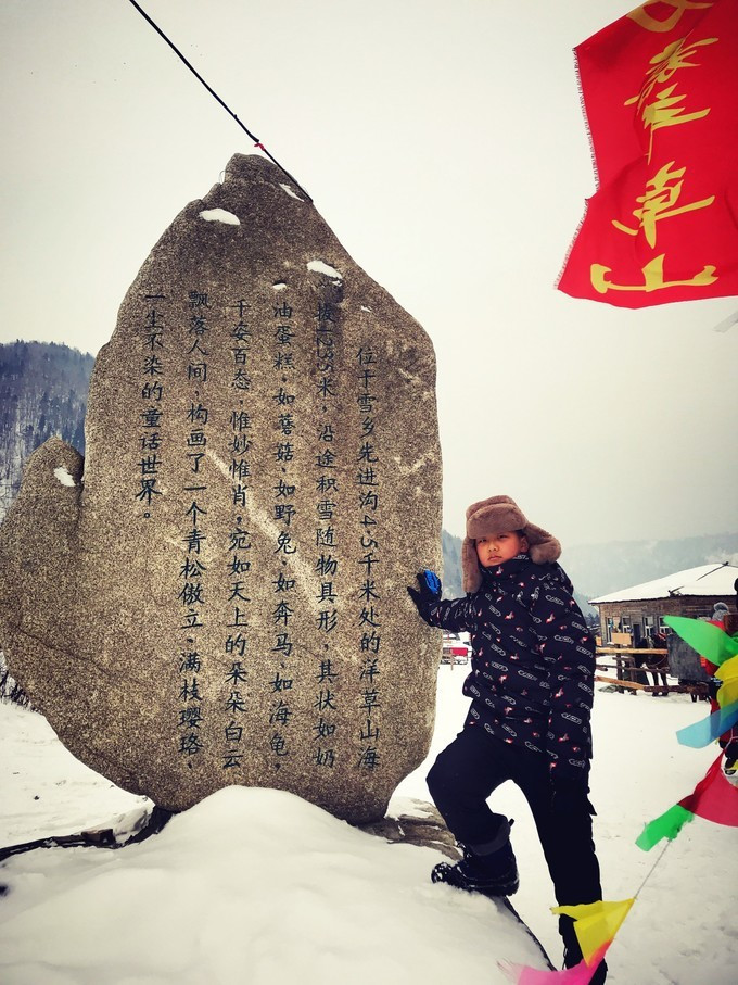 下午两点半的样子,我们终于抵达终点,穿过这块“界碑”(叨叨给取的名字),就可以看到 雪乡 广场纪念碑了。