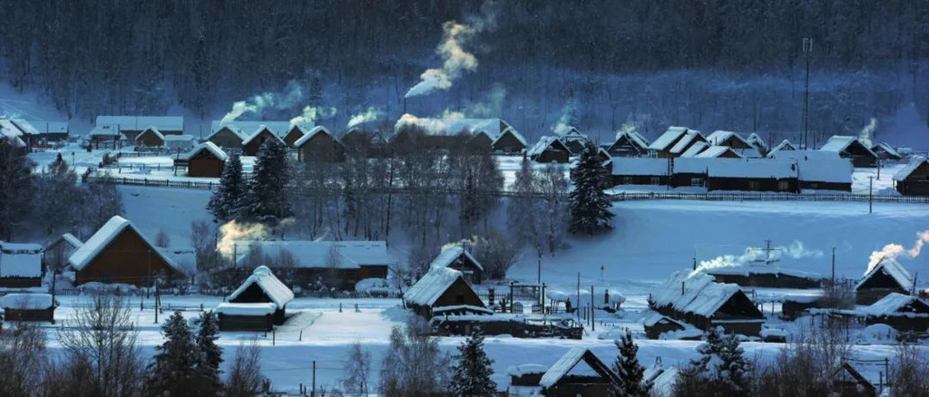 清晨的禾木,炊烟袅袅,阳光下雪花纷飞,地面闪着银色的光芒,站在观景台上,俯瞰着下方的村庄,前景是2米深的积雪,中景是鳞次栉比的白色木屋,远景是灰黑色的树林,无尽处则是蒙蒙的雪山。如果说秋天的禾木是一幅浓墨重彩的油画,那么冬天的禾木则是一幅色调淡雅的水墨画。