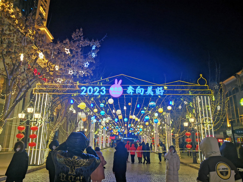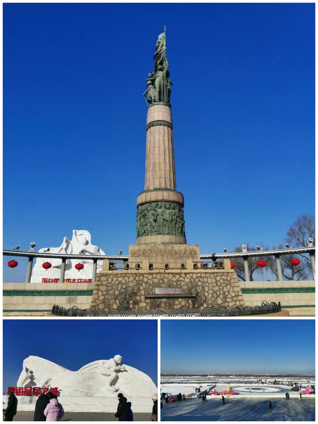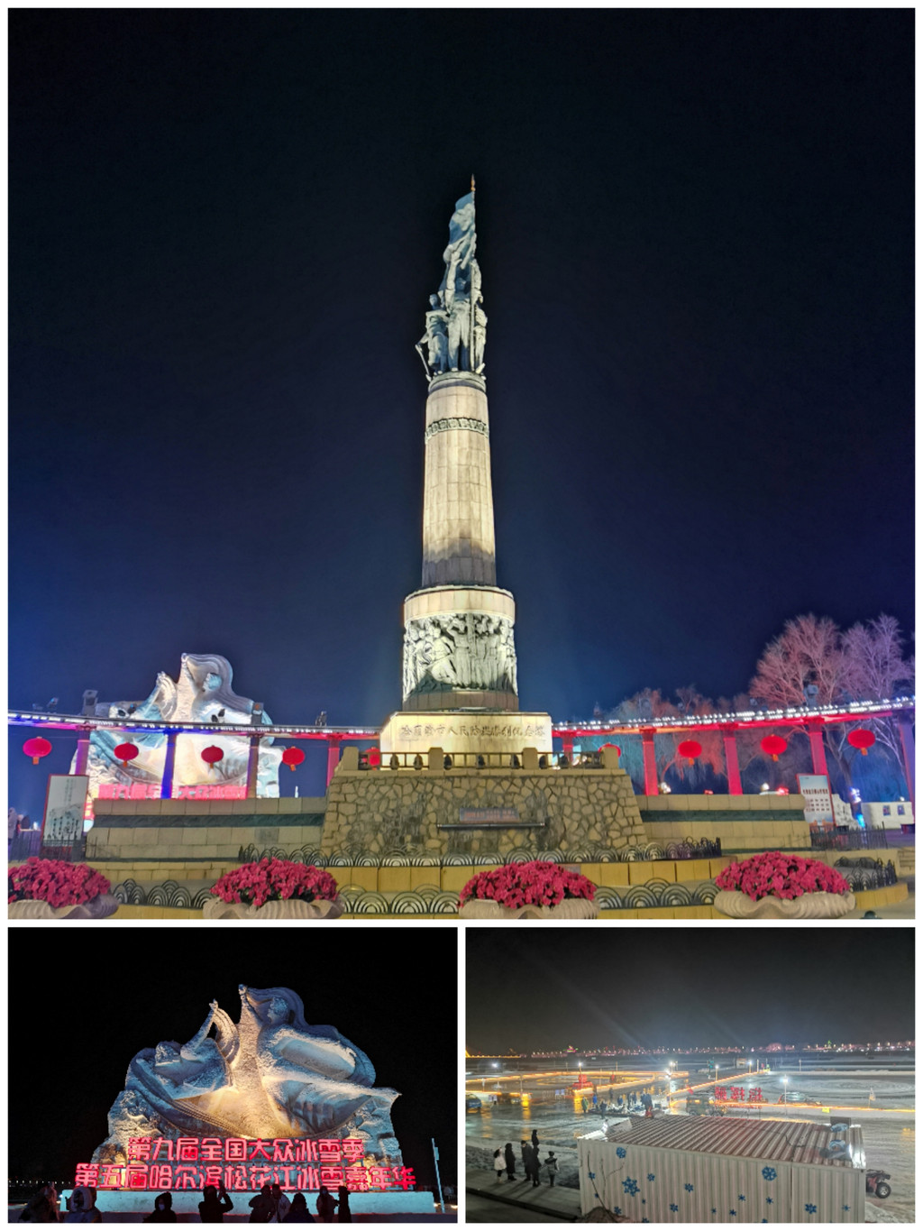 中央大街的尽头,就是松花江,防洪纪念塔就矗立在江边,两座巨型的雪雕,在大声呼喊着告诉来往的人们,这个城市来到了一年中最热闹繁忙的时刻!即便是这么低的温度,即便是临近晚上9点,江面上还是有依依不舍的游客被催着往回赶!