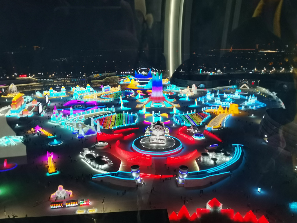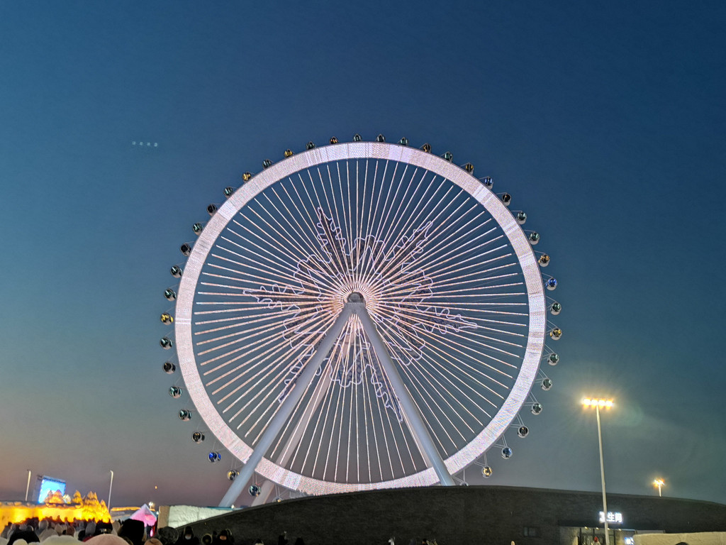 我在室内休息了下,顺便抢到了摩天轮的预约票。夜色来临,整个世界亮起了五颜六色的灯,比白天里冷冰冰的样子好一些了。去排队的时候,我给惊呆了。排成的长龙,起码有1公里的样子,我感觉我都找不到队尾,我觉得我走到队尾,我就得冻死。这个冰雪大世界里比别的地方要冷,主要还因为我的鞋子是薄薄的运动鞋,毫无保暖性,一直踩在冰上,可想而知。不过好不容易,预约上,怎么也要上去了,不然岂不是298元白花了。
