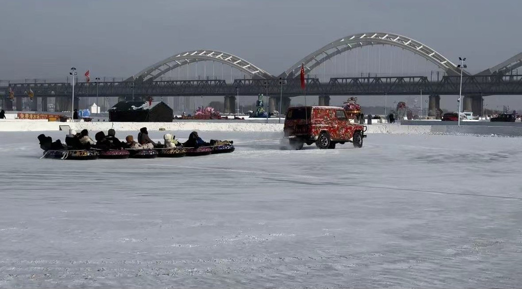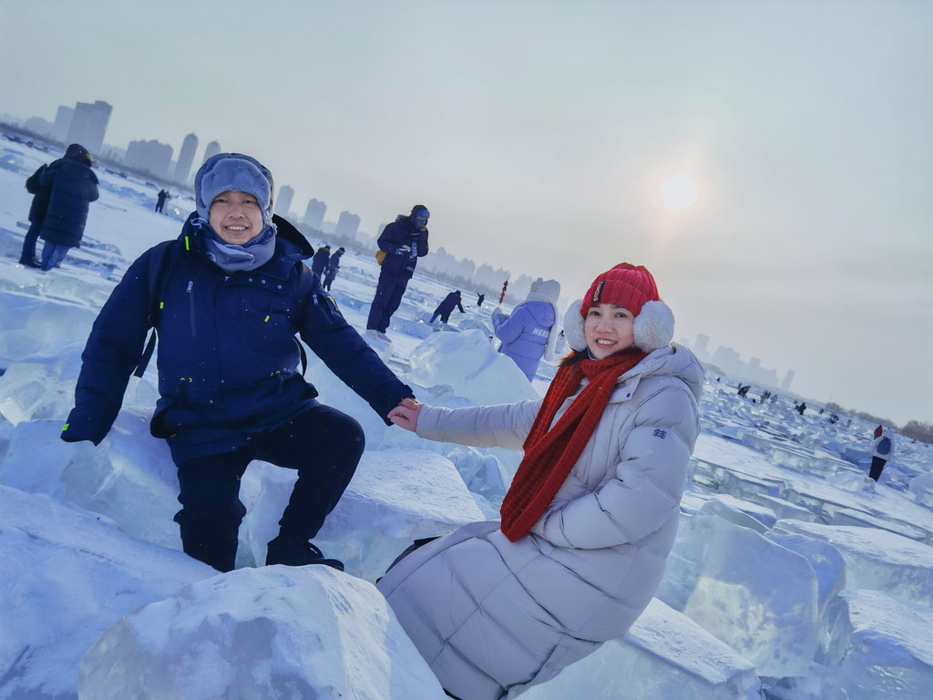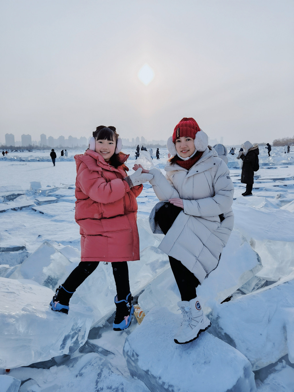 今天还有一个目的地,是松花江边的钻石海,这个是被小红书带火的,地点也是网友命名的,现在导航上可以直接找到“钻石海”这个地点了。据说这个就是修建冰雪大世界用剩的大冰块丢落在江边形成的景观,一个个大冰块就像散落的钻石。早上或太阳快下山的时候阳光落在冰块上会特别美。在打车的路上,看到了很多运冰块的大车,司机说现在正是松花江采冰期,为明年修建冰雪大世界储藏冰块,明年的亚冬会在哈尔滨举行,所以需要大量的冰块。在出租车上我的手脚已经缓过来了,下车后顺着路标来到了“钻石海”。这边都是一些年轻人来拍照的,现在太阳还有点高,其实晚一点光线会更好,老公的手拍一会就已经快冻僵了,所以没敢停留太长时间就往回赶了。