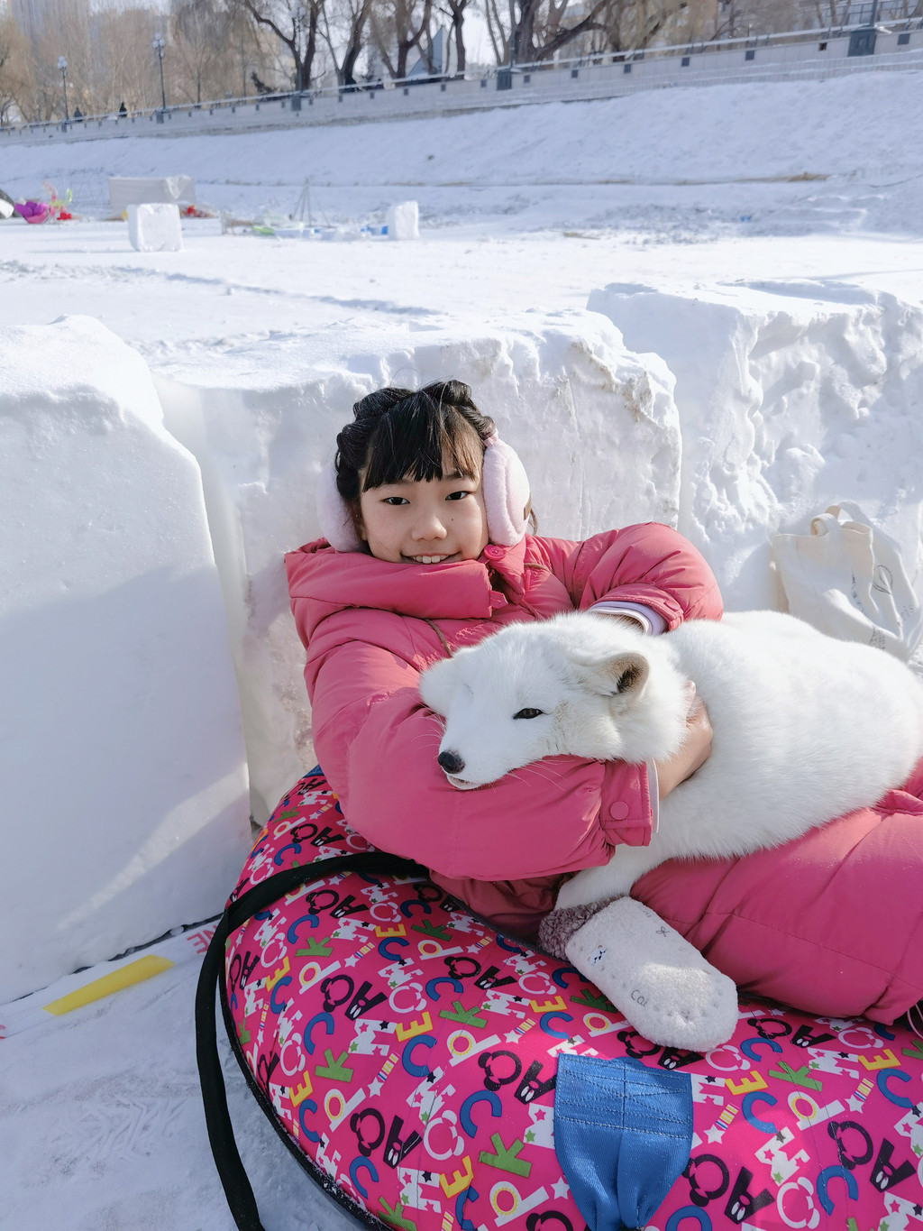 吃完饭出来走几步就是松花江,江面很宽广,冰上有很多娱乐项目,玩了雪地长龙,30元一位,一个吉普车在中间拉着一群人在冰面上转圈,不小心就会把帽子吹跑,除了风吹的有点冷还是很刺激。闺女看到江边还有抱着白狐的项目,昨天在中央大街也看到了,狐狸的毛又厚又软,摸起来非常暖和,看起来很温顺,花了30元抱着拍了几张照片。