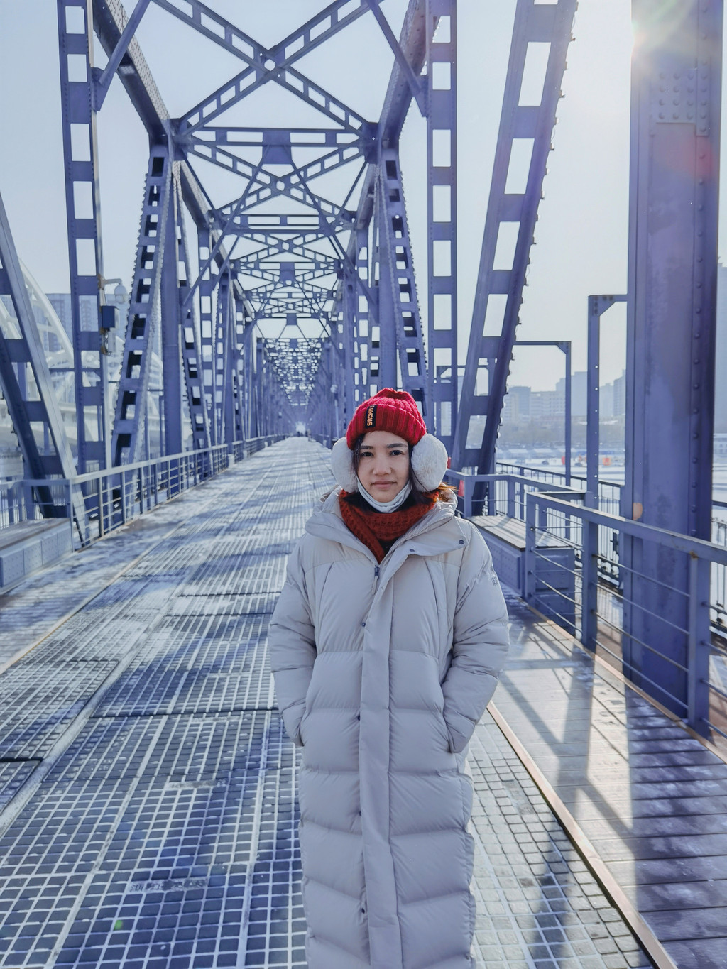 走几步就是松花江铁路桥,是一百多年前沙俄侵略者修的,是松花江上的第一座铁路桥,这种钢结构的桥梁很有特点,所以也变更了一个打卡地。开始想脱掉羽绒服拍几张照片,结果连一分钟都没坚持就赶紧穿上了,这个零下二十度的气温真的是不允许脱掉羽绒服啊。