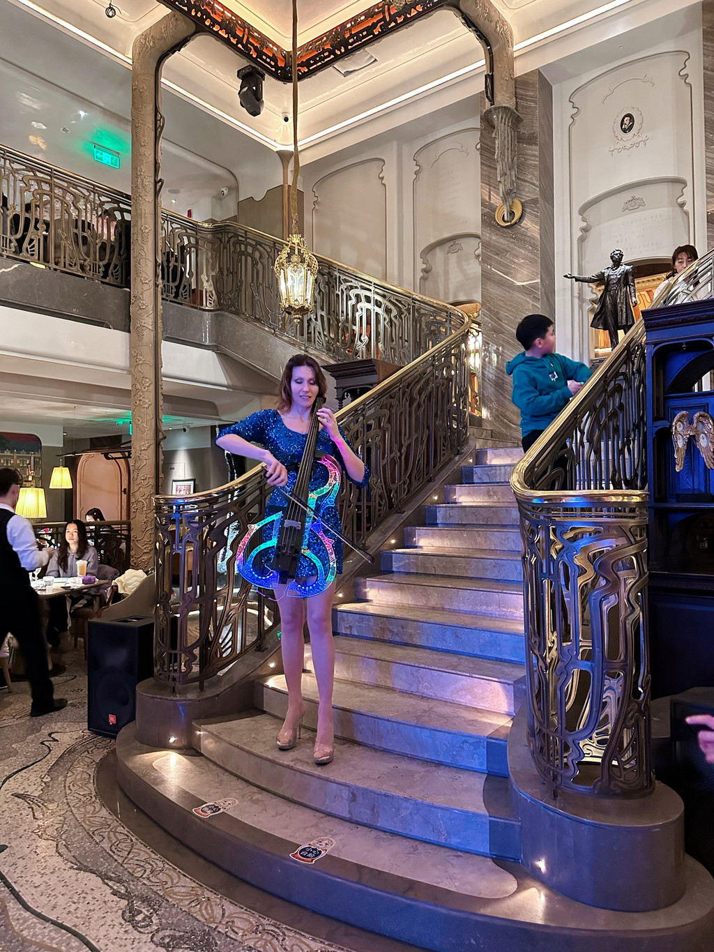 今天逛了一天晚上想吃点有特色的,除了东北菜,比较有特色的还有俄餐,从网上挑了一家比较正宗的店-波特曼西餐厅,在中央大街走了半天才找到。因为还没到用餐高峰,等了一会就有位置了。除了红菜汤吃不惯其他还可以,中途有俄罗斯中提琴表演,加服务费一共420。
