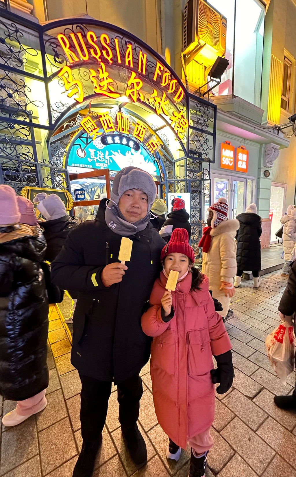 老公在十年前来过哈尔滨,但是忘记了从教堂到中央大街怎么走了,问了路边的商贩终于找到了中央大街。从大街的每一块地砖都能看出历史的悠久,两边的商铺都是各种风格的西方建筑,各有特点。走了一大段路,感觉似乎没那么冷了,也可能是适应了,吃了马迭尔冰棍,逛了逛各种店铺,晚上十点多开始往回走。闺女一路都觉得很新奇,在路边废弃冰雕的大冰块上都能玩半天,看来孩子的适应能力比我强多了。