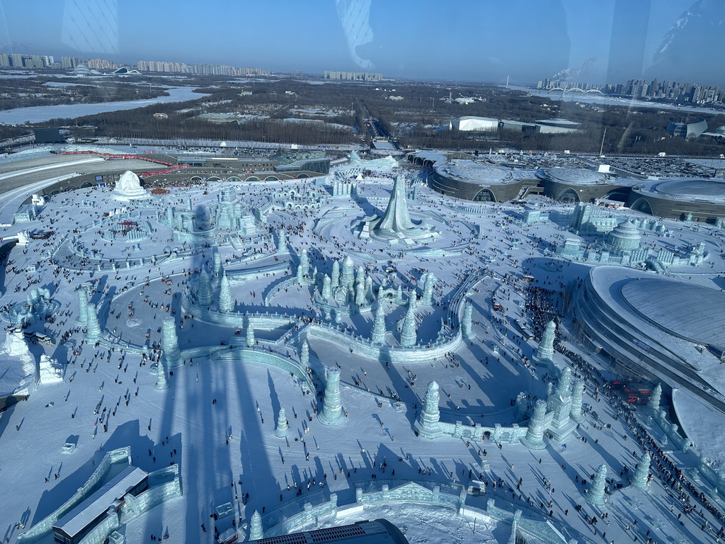 大滑梯项目排队时间三个小时起步,而且孩子身高不够,所以果断放弃。大概快中午才正式到景区内,先去排了摩天轮,大概一个小时,中午排队人还不算多。从摩天轮上可以看到整个景区的全貌,一座座冰雕雪雕尽收眼底,也可以从上面计划一会游览的路线。因为这里都是冰雪,所以气温比市区要低很多,室内休息的地方挤满了人,随着太阳的下山,冰雕的灯陆续亮了起来,使冰雕有个色彩,更增添了几分生气。不过气温也越来越低,感受了一下万人蹦迪的现场后就离开了景区。这个时间打车高峰,从这里打到车基本不可能,所以大家基本都是选择地铁,出门几分钟就是地铁站,进入地铁后身体终于慢慢缓了过来,冰雪的景色确实不错,但是经常需要露在外面的脸和手冻的快没有了知觉。