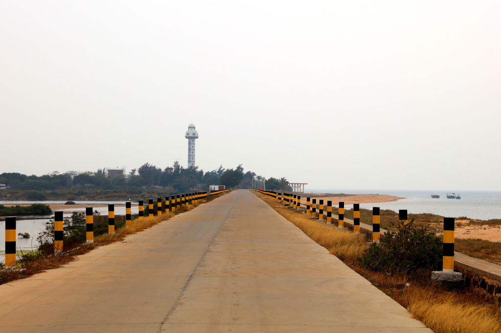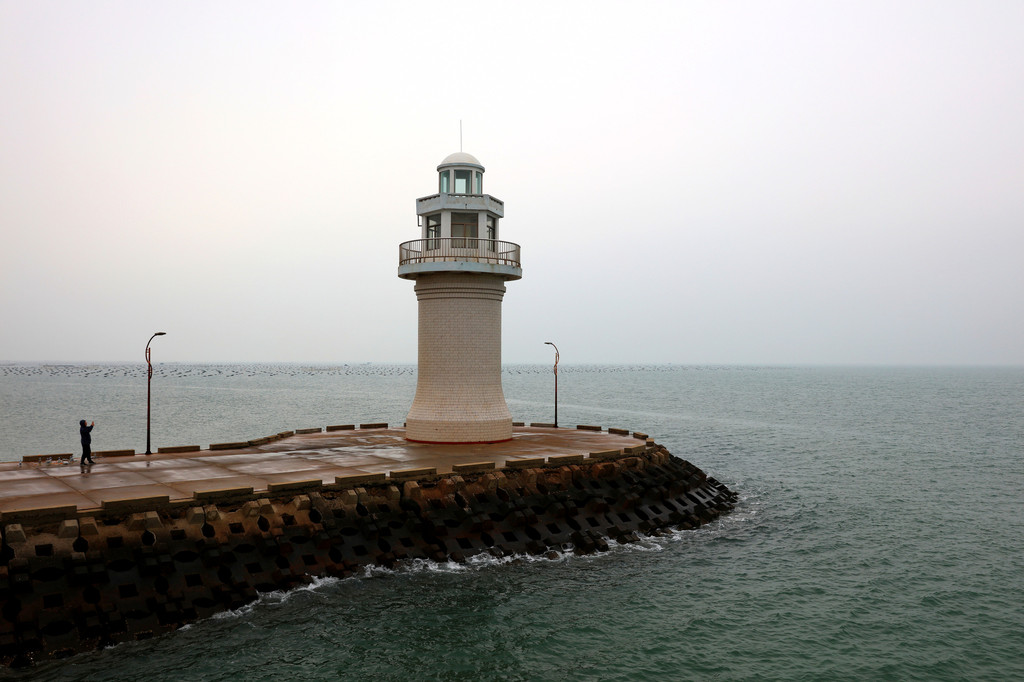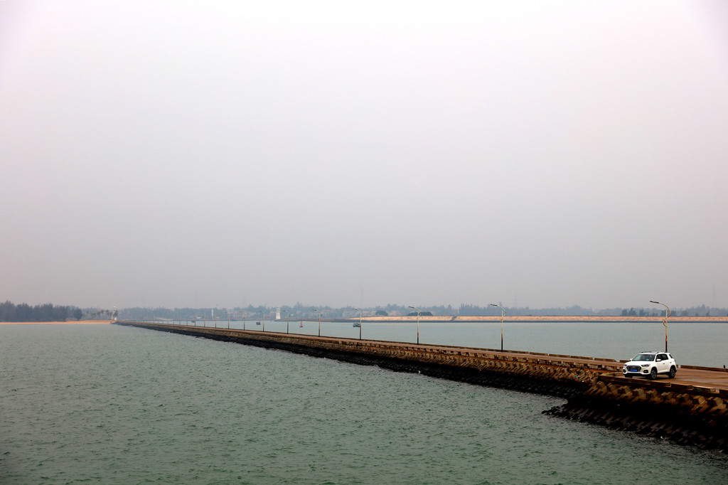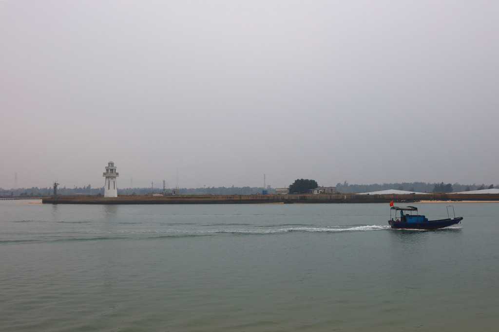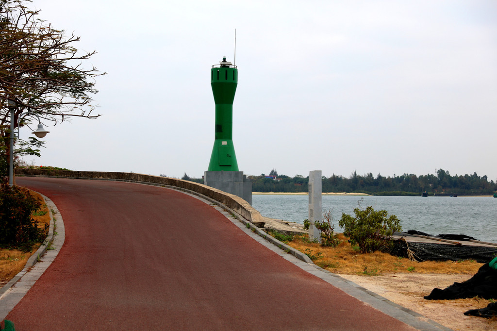 得知拦沙堤是度假村拍摄最美的日落的地方,虽然知道天气不好,别说日落,今天日出都看不到,但既然来了,还是去一探吧,开车来到度假村的尽头,300米长的拦沙堤恍如长龙卧波,从北拳半岛末端笔直地伸入大海,我们的汽车行驶在拦沙堤上,两边的海浪拍打着长堤,堤外有往来作业的渔船,开车来到白沙堤尽头灯塔,打开双耳,倾听海风的耳语最,涛声的欢呼,勤劳的渔民在海堤旁敲打生蚝发出的清脆声响,还有海鸥在海面略过时翅膀的呼呼声,渔船出海马达哒哒远去的背影,而大海很蓝,浪不大,小小的,慢慢掀起来一点点矮矮的浪花,然后往前扑一下,消失了,周而复始。天成台的这一片海,远离闹市,少有人听闻,但它有干净的沙滩、清爽的海风、洁白的灯塔和迷人的风景,这是电影一般梦幻的场景,而度假村椰风海韵,环境幽雅,这里自然观景绝对不亚于声名在外的海南三亚,可谓是人少景美的小众秘境。