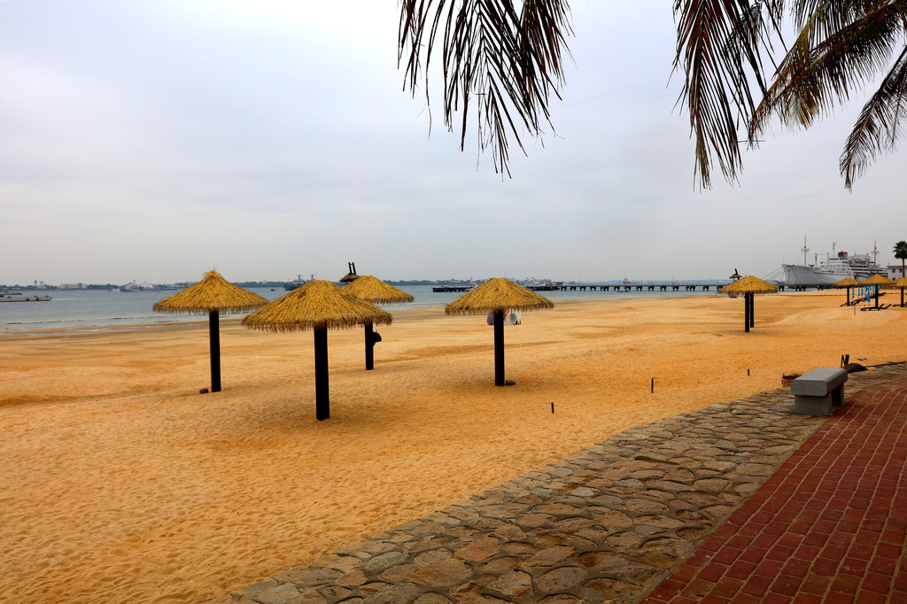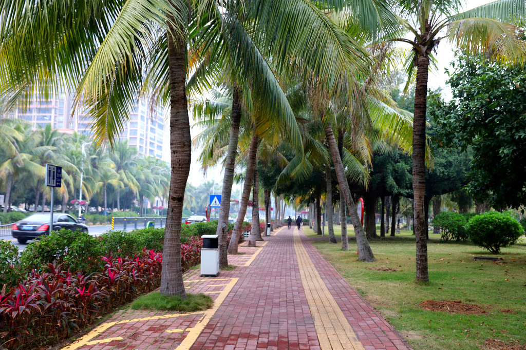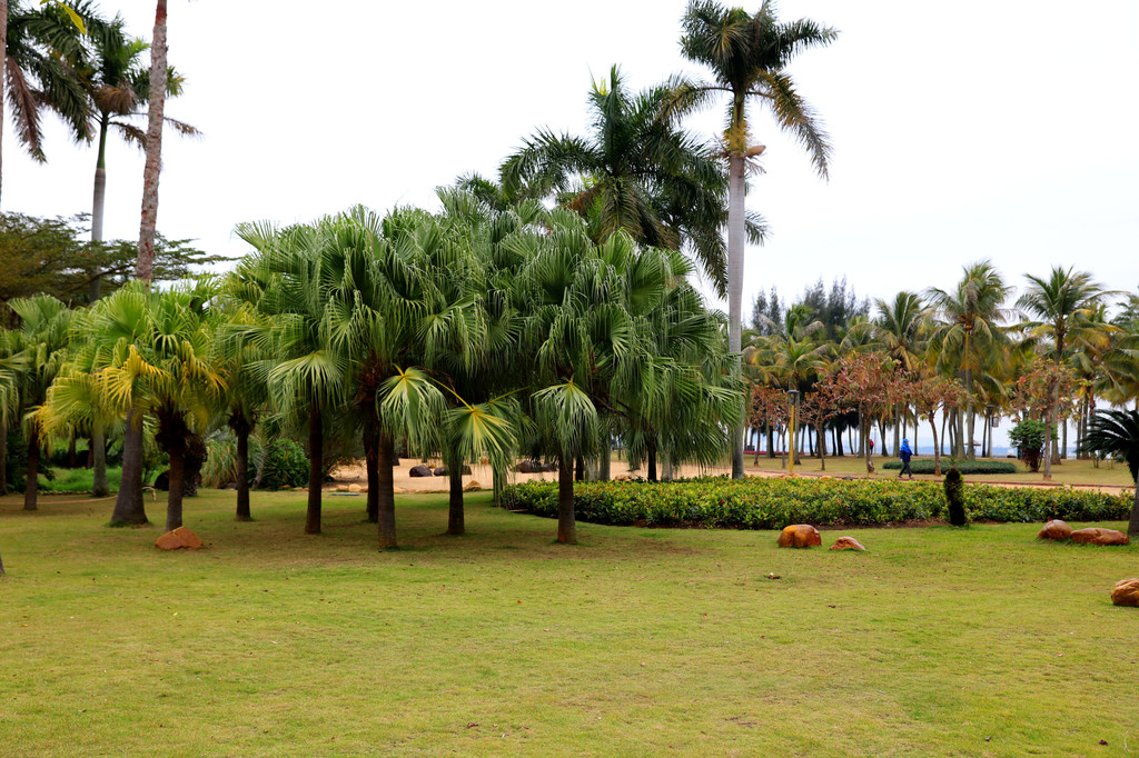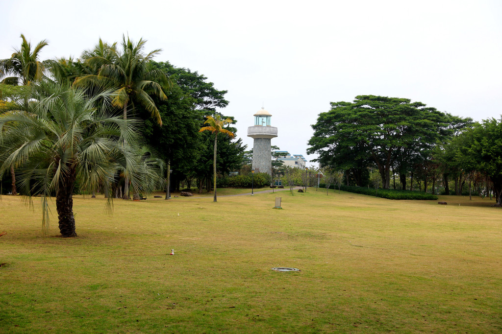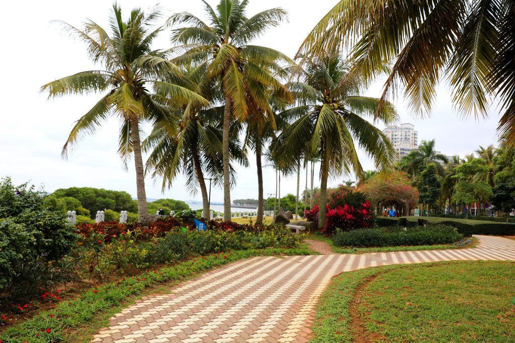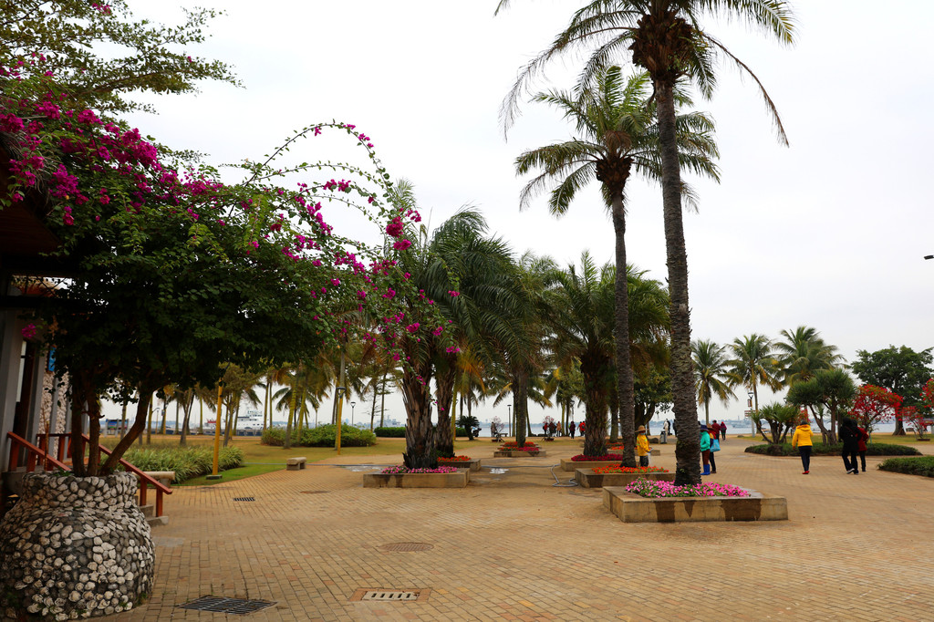 吃饱了喝足了,我们决定再去散散步,消消食,从宾馆的专用通道刷房卡出门,跨过马路就是渔港公园。虽然是免费公园,浓密的树荫,树荫下如锦的红花,如茵的芳草,还有高大的椰林,蔚蓝的波光,微风吹送着一阵阵的海潮音,这渔港公园的景物是何等地迷人呵,而柔软的沙滩、绝美的海岸线、椰风海韵,所谓的湛江风情在渔港公园完全展现出来了。虽然因为寒潮来袭,我们没有体验到“在上海冻成狗、在湛江暖如春”的舒适日子,但无遮挡的享受湛江湾迷人海景和秀丽的椰风长廊,让我们感觉湛江确实是个适合休闲度假的地方。