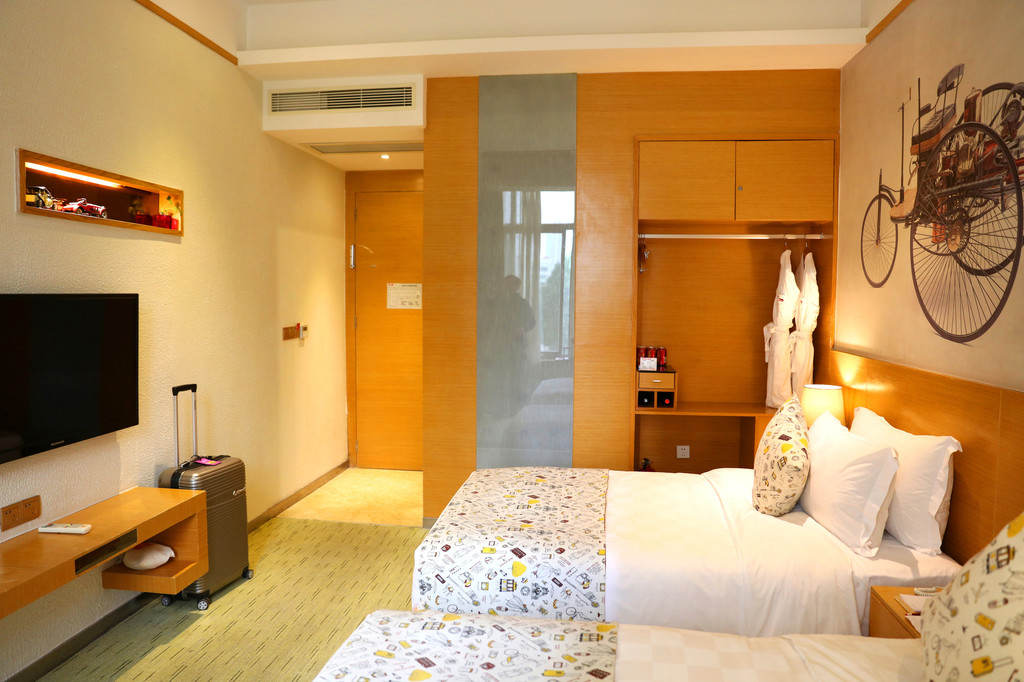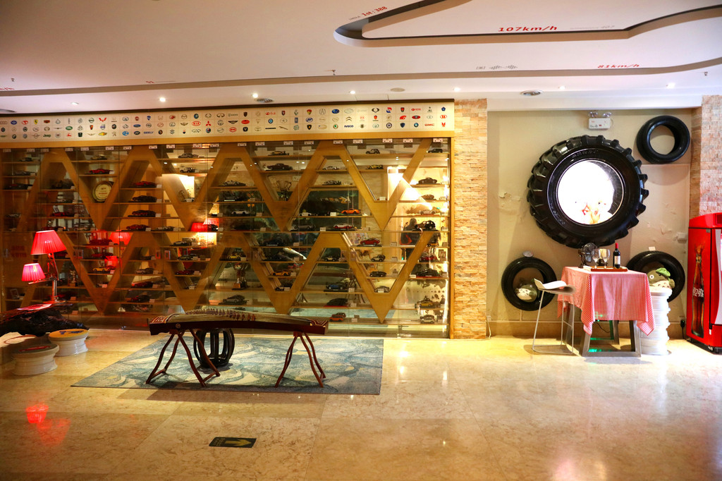 从徐闻南极村回到湛江市区我们第二天入住的酒店是位于湛江市区赤坎金沙湾观海长廊附近观海北路的湛江金富汽车主题酒店,因为这里都是新建筑,酒店建筑也是新的、门面不大,可是一进门的感觉非常不错,房间和公共区域都非常干净,装饰效果很有特色,汽车文化气息迎面而来,无论是挂在墙上的汽车零配件,放在楼梯间的各型号轮胎,还有大大小小珍藏的各类车模,抑或只是静驻在楼梯间角落的汽车维修设备。这些无处不在的汽车元素,将汽车的内部构造,文化历史与现代简约主流相互交融,听说这家酒店的主人是畅销书《女人向上》作者,虽然客房内是看不到海的,但客房内的设施相当不错,性价比很高,而我们入住这里主要是为了吃湛江著名的生蚝方便,因为不远处万象广场有湛江著名的连锁餐厅“烧蚝帮”旗舰店。走出酒店,过一条马路就是金沙湾观海长廊,蓝天,白云,绿树,鲜花,碧海,细沙应该是标配,可惜今天天气不好,广东遇到了好多年不遇的强冷空气来袭,天空阴沉,海边风越来越大,体感也明显觉得温度下降了。好在万象城广场就在金沙湾观海长廊旁,我们赶紧去了位于广场一层的烧蚝帮万象广场店。
