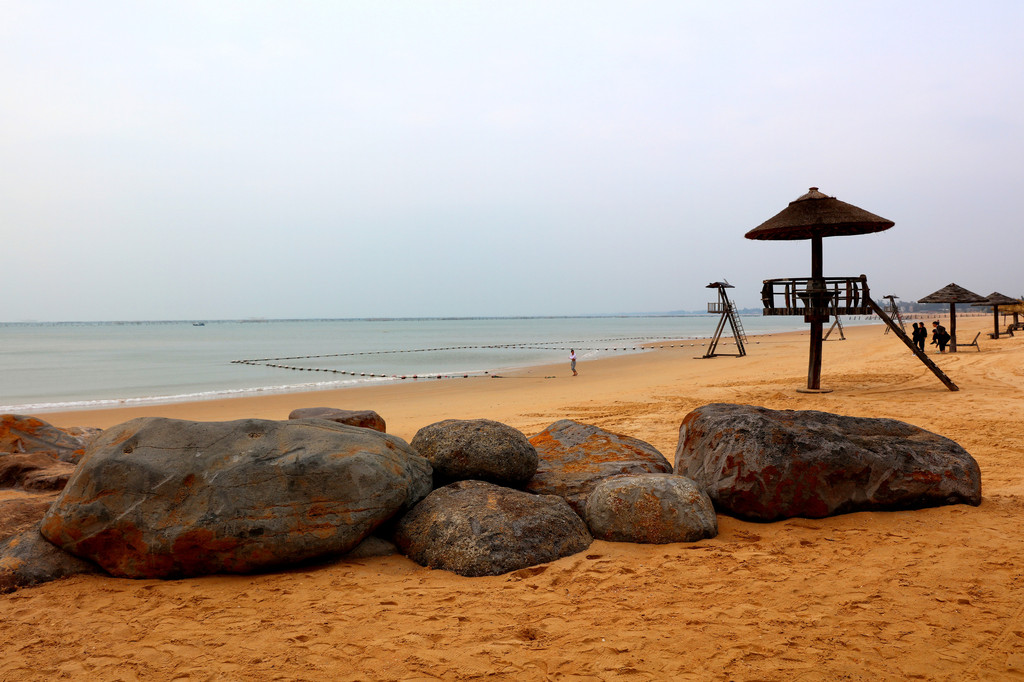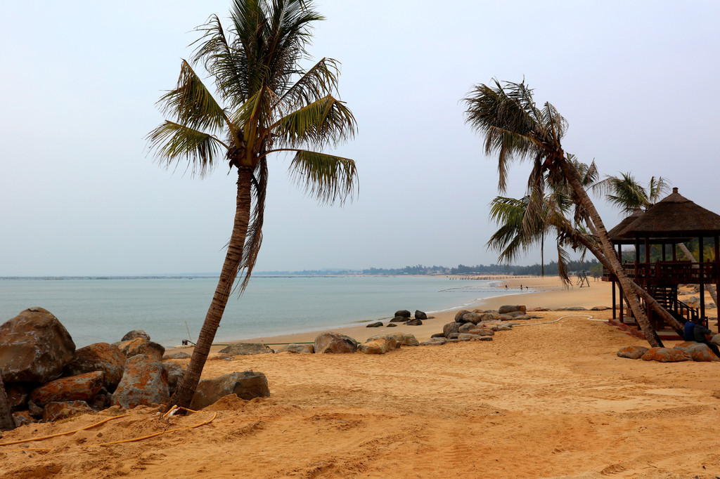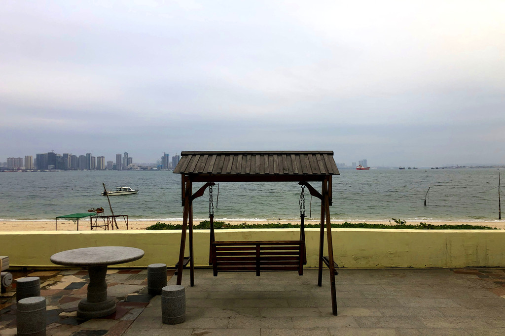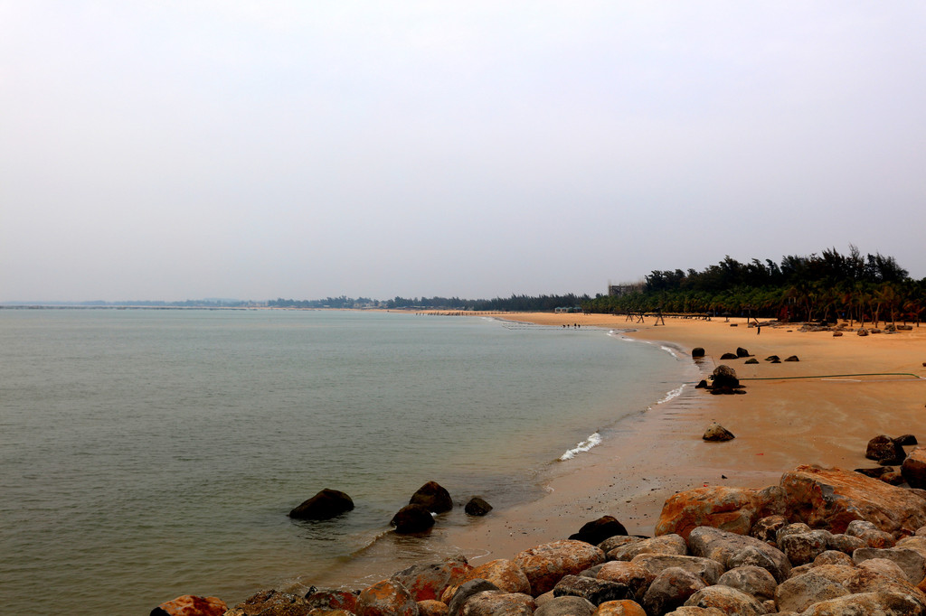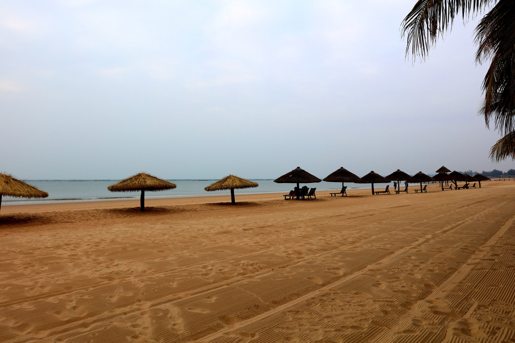 离开雷州古城,驶上了G15沈海高速,平时在家上班总要驶过一段沈海高速,领教过几乎拥堵常态化的G15高速公路上海段,今天驶上这段马上要到尽头的G15高速,一是觉得亲切,二是感叹在这里G15高速会变得如此空畅,真是同路不同命啊。在空荡荡的G15高速上只开行了短短一段又下了高速,这里的道路真不敢苟同,基本都是村道等级,道路狭窄,七转八弯穿行在田野与乡村间,好在路上的车不多,从另一方面也可以看出这里的经济发展水平。一个多小时后我们来到了位于雷州半岛西海岸北拳半岛的乌石镇、国家中心渔港乌石港对面的一个月牙型小半岛上的乌石天成台度假村,这里号称是中国西海岸最美落日观赏地,湛江的“马尔代夫”,进度假村要10元/人的门票,如入住的客人办入住后会退回门票费。办完入住,一看天气,估计看今天的日落概率是很小了,但我们还是迫不急待地奔向海滩。这片海滩有个美妙的名字,叫金沙滩,长达4公里。渐变色的湛蓝海水一波又一波地涌动着,信步于海滩上,脚下踩着柔软而细腻的纯白沙滩,身旁是与天相接的清澈海水,海边一长排空空的木椅,木椅后面是一排被微风吹的裟裟作响的椰树,此刻仿佛整个世界只有天、海与你。登上木竹构架、亭面薄草盖成蘑菇状的亭台,极目海天舒,心胸无比开阔。