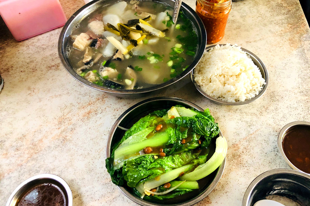 原先我们做的行程攻略上并没有雷州古城及雷州西湖,因为飞抵湛江机场,提好所租的车已是中午11点多了,我们的目的地雷州天成台度假村车程约二小时,一算、我们抵天成台度假村处于很尴尬时间,入住有点早,午饭又有点晚,一看导航,雷州古城正好处于中点,车程约一小时,临时起意,决定去雷州古城午餐,然后顺便再逛逛古城与西湖。来到铺天盖地都是摩托、电驴的雷州街头,和在电视里看到的越南街头的情景好相似。一看己是饭点时间,决定就去找吃的,因为赶时间午餐准备简餐,在某点评上一搜,好像这里吃牛杂的小店很多,沿着波光潋滟的雷州西湖边的小巷走,这条小巷上集中了一排专做牛杂的小餐馆,选了点评上排第一的牛杂店,确实当地人多的店味道不会差,来上一大盆白煮的牛杂加汤,再来一盆蚝油生菜,配上米饭,满满的食欲。