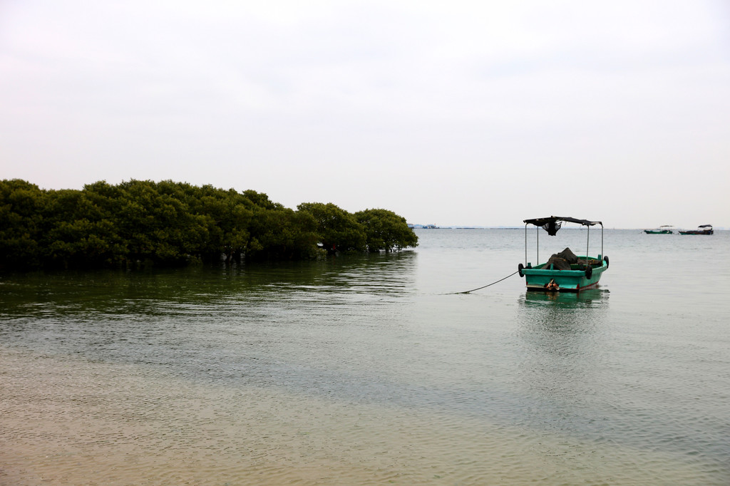 除了军港,赤坎老街, 所谓湛江风情就是:椰风、白沙、渔家生活 。我们第三天入住的地方就在位于湛江市区对面以体验渔家生活为特色的特呈岛,前往特呈岛有二种方法:如需带车上岛,从霞山海滨码头有车客渡每天往返共有十二班渡轮,小车每辆来回七十元,车上乘客不用买票,但因为每次渡轮只能装载十多辆车,可能候渡时间较长,那就采用第二种方法:在湛江的渔人码头乘快艇,每隔半小时就有一趟船,船票比较充裕,现场买就行,五十元一人往返,船票含特呈岛温泉度假村门票,渔人码头至特呈岛行船时间十多分钟,但汽车就没法上岛了,渔人码头有停车场,停车费十五元一天,特呈岛不大,上岛后可花四十元租借一辆电瓶车绕岛游。特呈岛与湛江市区隔海相望,上岛主要就是体验渔家风情,看红树林,还有就是去度假村洗温泉,不过好像目前度假村烂尾了,度假村内一片破落,温泉也不开放了。不过我们入住的海景渔庄倒是不错,占据着岛上最佳位置,老板和老板娘非常热情,房间是无敌海景房,出门十多米就是一片漂亮的沙滩,可惜我们遇到了湛江几十年不遇的寒潮,老板娘说前几天气温还在二十多度,客人们还在沙滩上吃烧烤,玩海水,今天一下子降温了将近二十度,海边风大气温又低,根本没法在海滩边多呆一会。我们在老板家每人花四十元租了电瓶车,沿着岛绕了一圈,大约二个小时就够了。老板家的晚餐也不错,价格合理,海鲜新鲜,我们还在海景渔庄里碰到了上海老乡、一帮共九人,因为他们之中有人以前曾来过这里,发现这里环境不错,价格又便宜,今年又约了一大帮人来这里度假避寒了,并去对岸的海鲜市场买了海鲜自己做饭做菜。