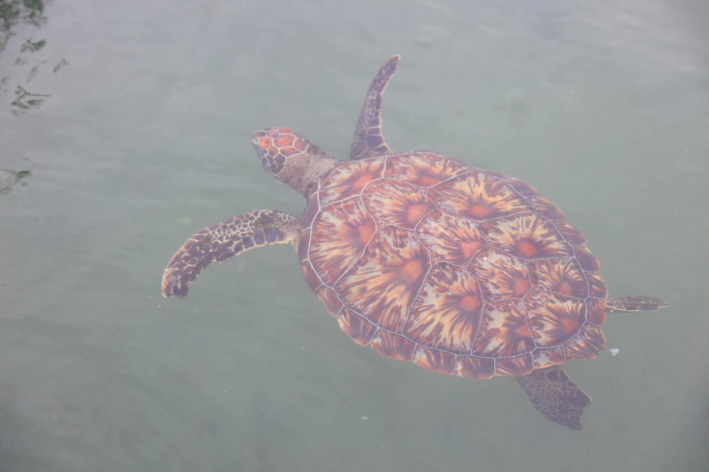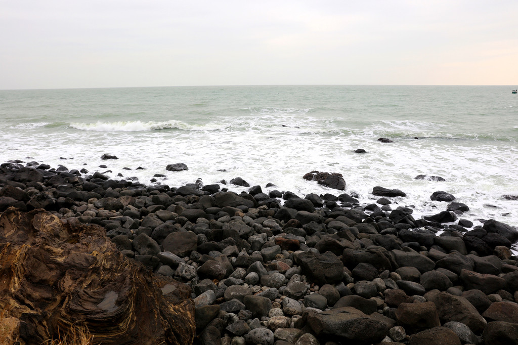 早晨,我们乘坐8:45分第一班快艇离开只待了十几个小时的特呈岛,开车前往七十多公里外的硇洲岛,先经过由跨海大桥连接的中国第五大岛、广东第一大岛的东海岛。这里的龙海天号称是“中国第一长滩”,可与意大利的“黄金海滩”媲美。不过此刻我们来这里的时间不对,又是寒潮,又是阴天,这种天气显然不是玩海滩的好时机。在东海岛东南码头乘车客渡轮经半个小时航行,我们上了硇洲岛。一上岛满眼都是香蕉树林与火龙果树,硇洲岛人种香蕉源于上世纪的1992年,当时岛上几户人家只是抱着试试看的态度在硇洲岛上种起了香蕉,却未料此举让硇洲岛变成了如今种植面积过万亩、占全岛耕地面积86%的香蕉岛,“硇洲岛香蕉”一跃成为全岛经济支柱之一,我们后来买了叫作小米蕉品种的香蕉,又糯又甜。而硇洲火龙果,因抗台风效益好,已逐渐形成朝阳产业。我们的第一站是那晏海海滩,因为硇洲岛是中国第一大火山岛,海滩边有许多火山喷发后留下的火山石,还有层次分明的仙人掌火山岩,站在岸边堆积的熔岩乱石之上,雾霭茫茫,水天一线,惊涛如诉。那晏海海滩旁边有一海龟城,是一处人工养殖,繁殖海龟的场处,花五元钱可进门领冬瓜去喂海龟,这个挺适合带小朋友去。我们站在海龟城前,看尽硇洲岛的岛屿风光:云蒸霞蔚、浩瀚无涯,海上的点点渔船就像是镶嵌在海面上的珍珠,光彩夺目。