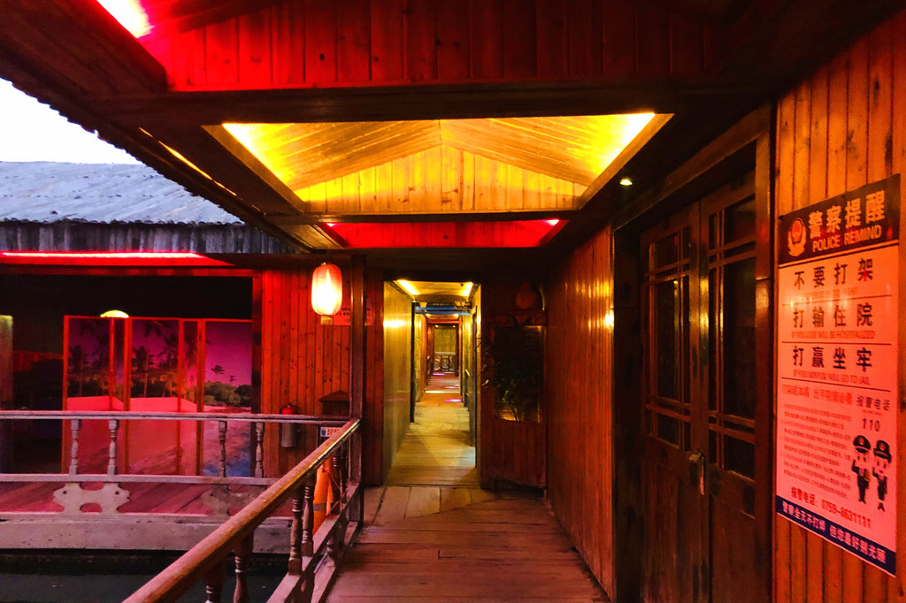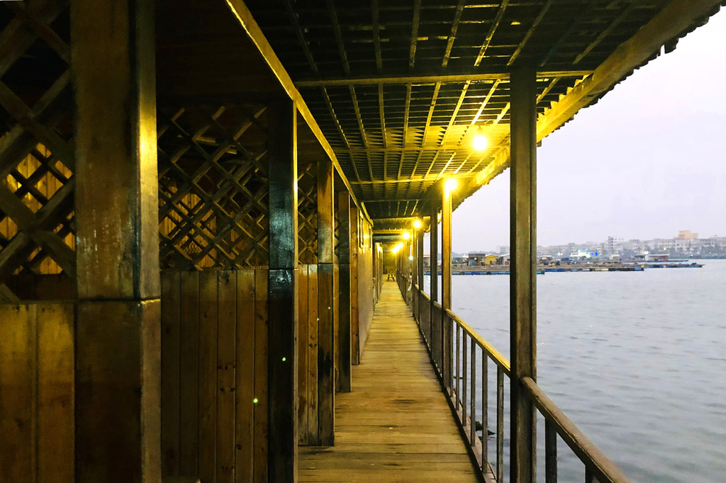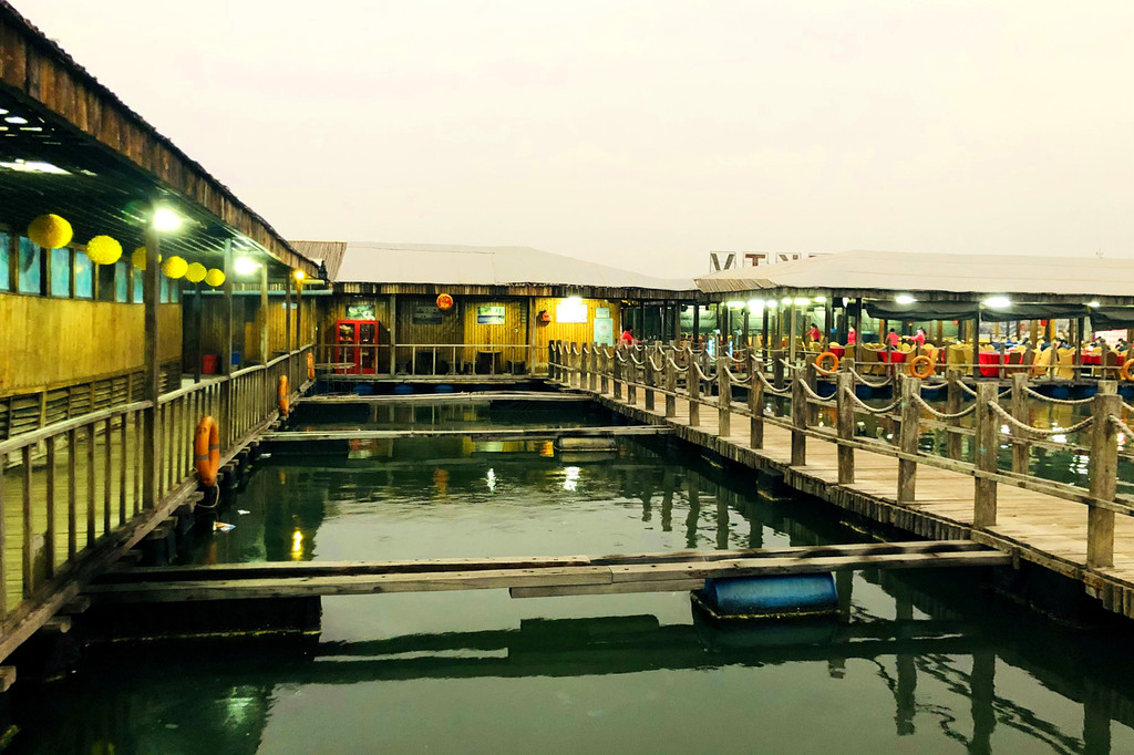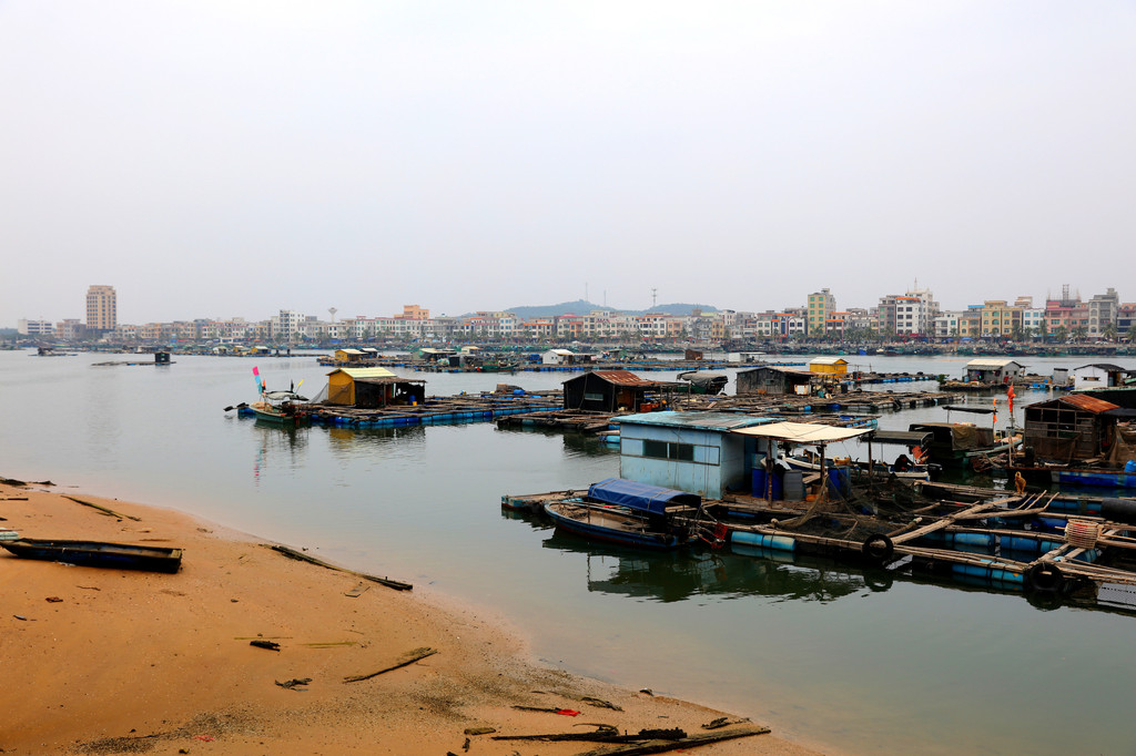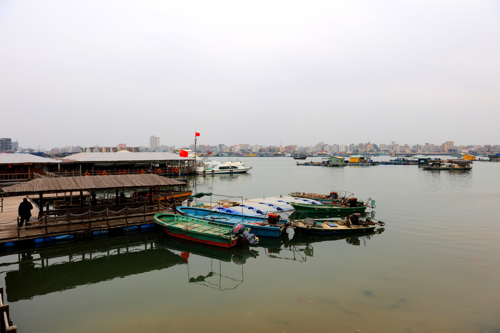 与期待的日落无缘相见,但饭还是要吃的,乌石港靠近北部湾渔场,是广东省西南沿海及海南广西北部湾作业渔船的海上生产补给渔货物集散的重要渔港。因此这里盛产各类海鲜,晚餐肯定是海鲜伺候了,不想走太远,好在度假村里有一家很出名的餐厅:疍家乐渔排海鲜餐厅。疍(dàn)家人是对中国沿海地区水上居民的一个统称,主要分布于广西、广东、福建和海南等省份,疍民即水上居民,因像饱和盐溶液之上的鸡蛋,长年累月浮于海上,故名为疍民,祖祖辈辈靠打鱼为生,以舟楫为家,生活随着潮汐起落而变化。疍家乐渔排海鲜餐厅位于度假村不远的乌石渔港海湾内,整座餐厅是搭在渔排上的,渔港对岸的居民也常坐船来这儿吃,我们顺着浮桥,进入大排档,浮桥下方是装海鲜的网箱,食材新鲜,我们现场挑海鲜,店家现场加工。度假村附近海域繁殖着大量的生猛海鲜,生蚝、扇贝、干品鱼虾、鲍鱼等等应有尽有,餐厅很有特色,我们点的海鲜味道不错,但价格不便宜。