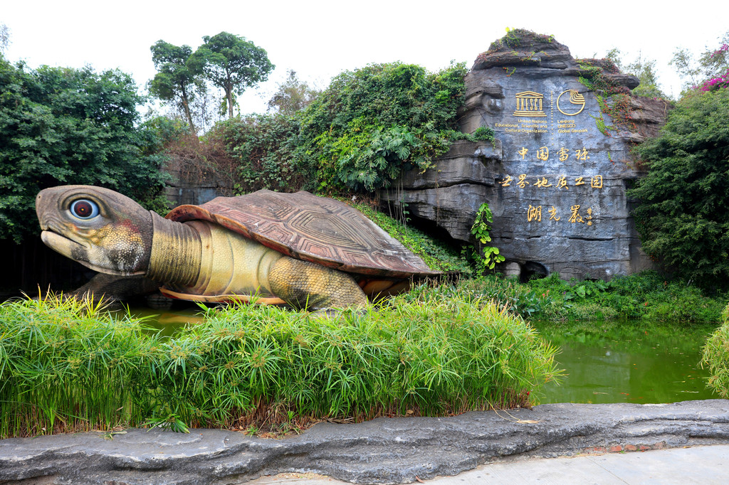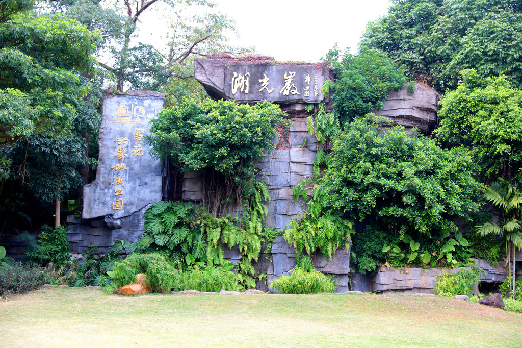 湖光岩玛珥湖是世界上除德国Manderscheid之外仅存的玛珥湖,是国家地质公园、国家AAAAA级旅游景区,居湛江八景之首。进入大门,下了阶梯,看见一片被葱郁树木环绕的水域,这便是湖光岩景区内的核心景点――玛珥湖。湖边的草地更养眼,一大片的,远处的景有些朦胧,如蒙纱的少女。用波光潋滟来描述此刻的湖光岩最贴切了,这个面积不大的火山湖在地质学者眼里具有极其重要的地质研究价值,玛珥湖是一种极其稀有的火山湖,是火山爆发冷却后,下沉的积水形成的,因为来自地下水的渗透,具有天然的自我净化功能,所以无论旱涝都永远不会干涸。长期以来,玛珥湖出现了各种神秘的奇迹,如终年落叶无踪、蛙蛇绝迹,湖心的水比湖边始终低30厘米等谜团。世界上两个玛珥湖,除了湖光岩,还有一个在德国,德国玛珥湖面积仅0.3平方公里,我们的比它大几十倍,世界上最大的玛珥湖居然就在自己的眼前,而在传说中,这里又是一处神秘之地,说的是有人在湖光岩目睹了4米多长的龙鱼和2米宽的大龟遨游湖中,类似喀纳斯湖的水怪,为此景区在湖光岩东门广场修建了这么个龙鱼神龟雕像。