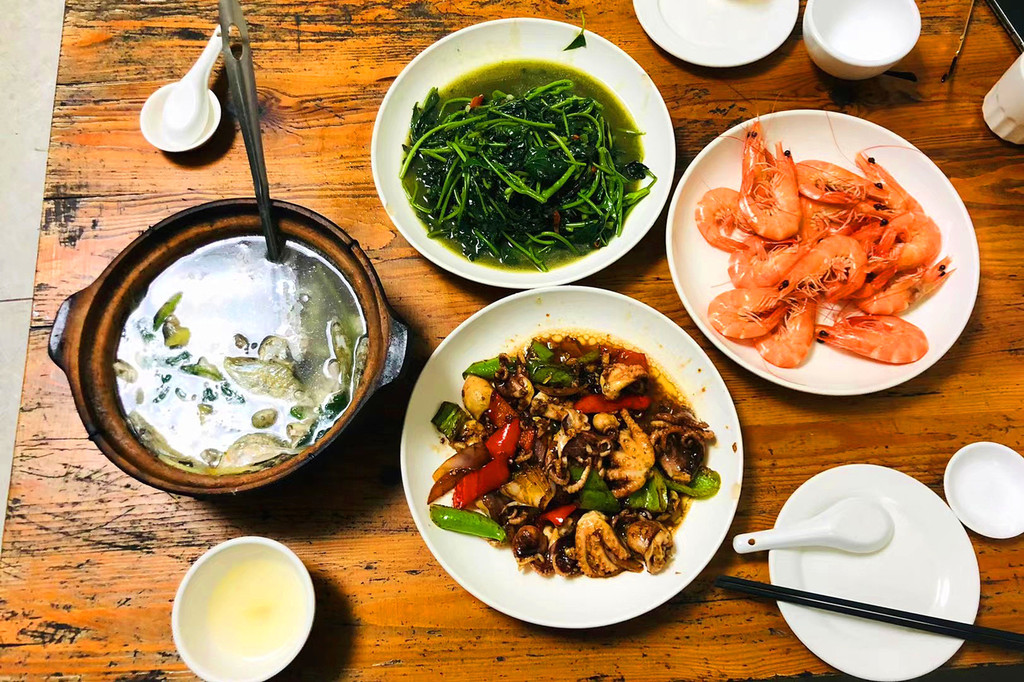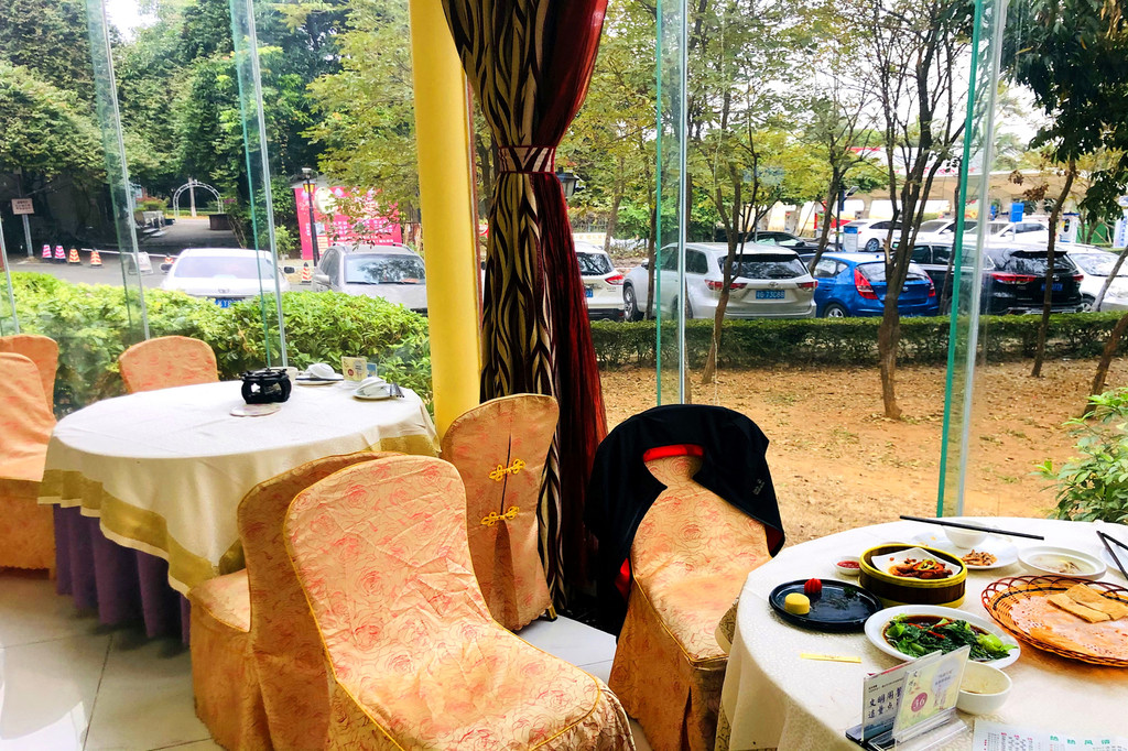 不知什么原因,目前天成台度假村内自已的餐厅不开放,他们推荐从度假村步行约几百米位于海上渔排上的疍家乐渔排海鲜餐厅,这家餐厅搭在渔排上,很有特色,渔排下是装海鲜的网箱,食材新鲜,客人现场挑海鲜,店家现场加工,味道不错,但价格偏贵,如不怕麻烦可去几公里外对岸乌石镇上,那里海鲜餐厅排挡一应俱全,而且价格也亲民的多。