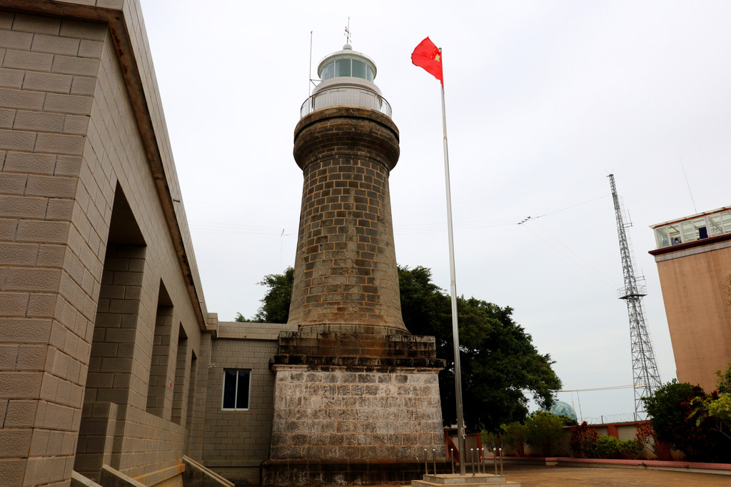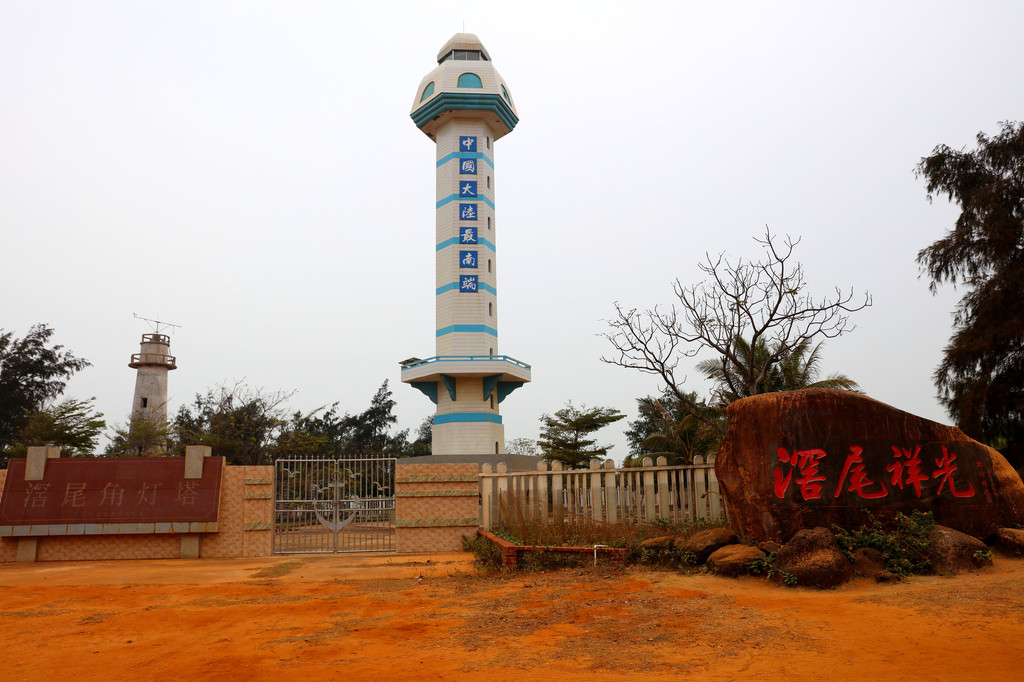 我们在车上远远看到的“灯楼角”灯塔,塔身蓝白相间,如擎天巨柱,来到三面环海,有一处用三块石头堆起并题有中国南极村的标志的地方,但这里其实并没有村庄,这南极村是由风车、灯塔、椰树、海滩、珊瑚礁组成的滨海景观,这里有一高一低二座灯塔,还有一幢石砌目前搭满了脚手架正在维修的建筑,原来这座楼是当年解放海南岛时渡海作战指挥部,而最初的塔是法国人在清朝年间兴建的,法国人在此角尖上和海南临高角各建造了一座铁架结构海航灯塔,高约16米,这座灯塔形似楼梯,故称灯楼,因此这里也叫作灯楼角,现在的这座叫滘尾角的灯塔是改革开放后重建的,在新建的灯塔上题有“中国大陆最南端”七个大字,这座新灯塔也是琼州海峡和北部湾唯一的航标。
