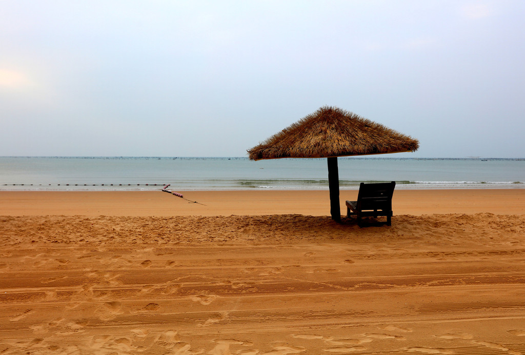 也许是没有太多商业开发的原因,这里没有人声鼎沸,有的只是海浪轻拍沙滩的韵律,在这里,一望无际的大海就是你专属的天地。不死心找张木椅安安寂静地躺着,等待着基本无望的日落到来,此刻在这原本是碧海云天的海湾里,吹着微咸的海风,呼吸清新的空气,眺望一望无际的辽阔海面,感觉心中再汹如波涛的烦闷也会逐渐一并归于这微风起漾的静海。