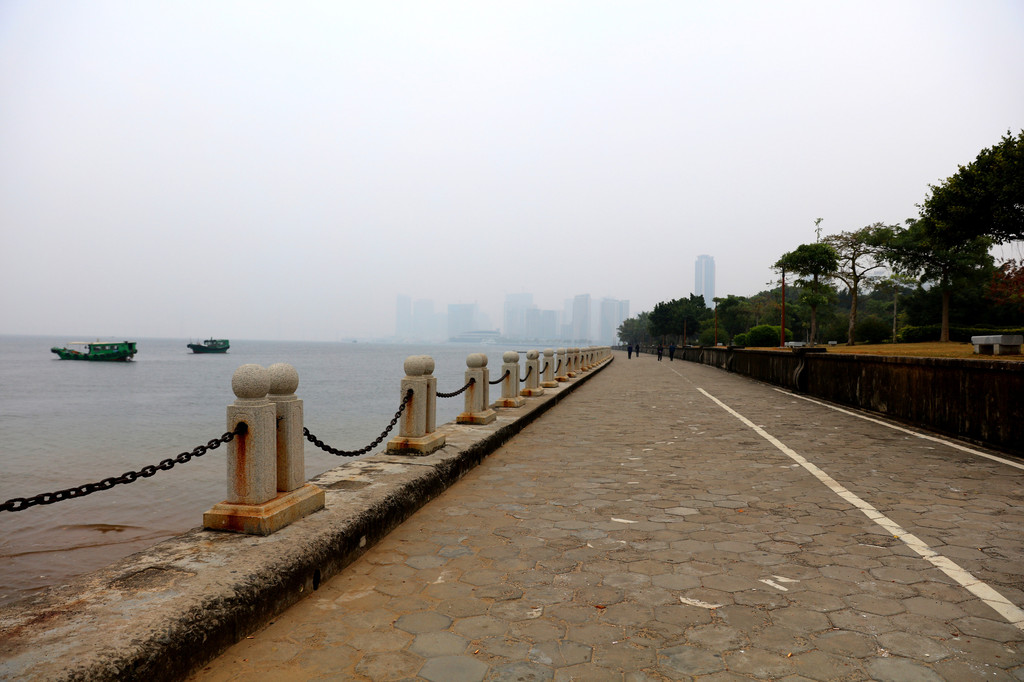从徐闻中国大陆最南端一路狂奔回到湛江市区,入住位于赤坎区金沙湾畔观海北路的湛江金富汽车主题酒店,在酒店稍作休息后又按奈不住心情出来来看海。跨过与酒店一路之隔的观海北路就是金沙湾观海长廊,这里是湛江市实施“一海两岸”西海岸景观改造工程的组成部分,一边是拔地而起的林立高楼,一边是绿树,绿树,鲜花,碧海,细沙..........遗憾的是因为北方冷空气南下影响,天空阴沉沉,没了蓝天与白云,我们走在观海长廊上凛冽的寒风一阵阵吹来,呈延绵2.65公里的赤坎金沙湾观海长廊游人无几,原本这里是赏景、散步、谈心、玩耍、锻练的一大好去处,也是近距离欣赏湛江海湾大桥全貌的最佳位置,现在我们却有一种在碧海椰林,白沙长椅里“冻成狗”的感觉,被寒风吹的实在受不了,赶紧去不远的万象广场去吃湛江生蚝了。
