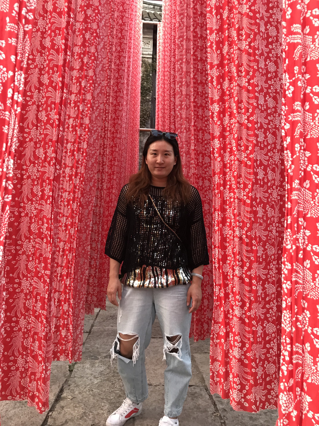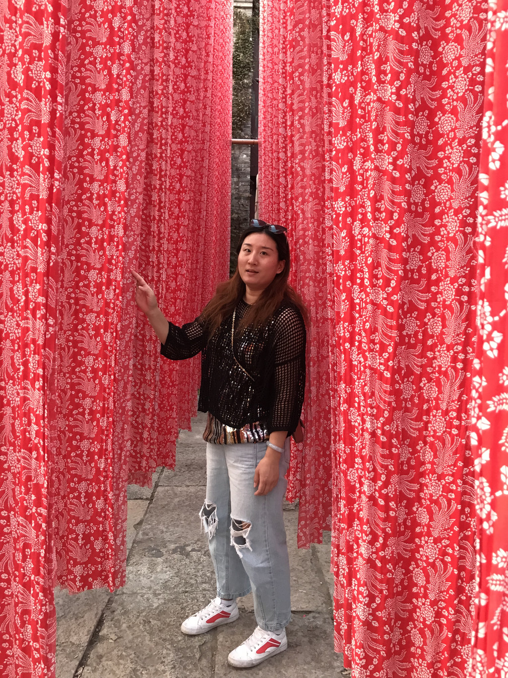 人比花布艳,大红色碎步花布,十分艳丽,色彩吉利喜庆,美观大方