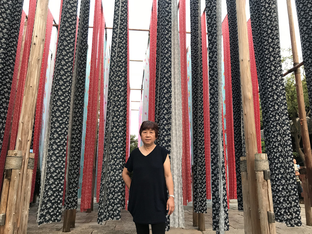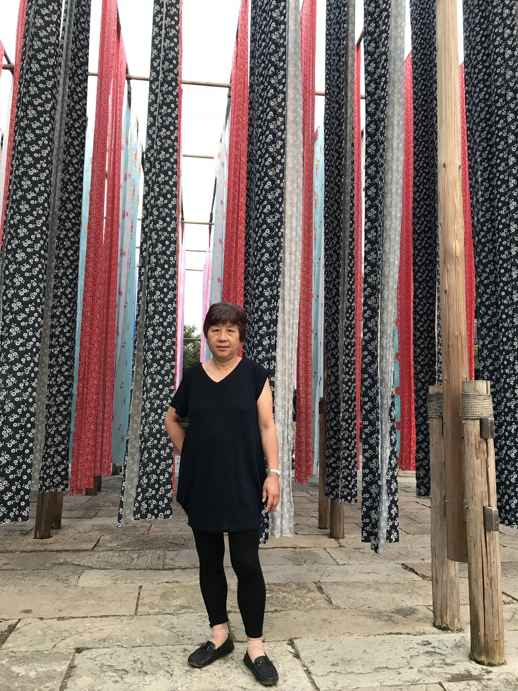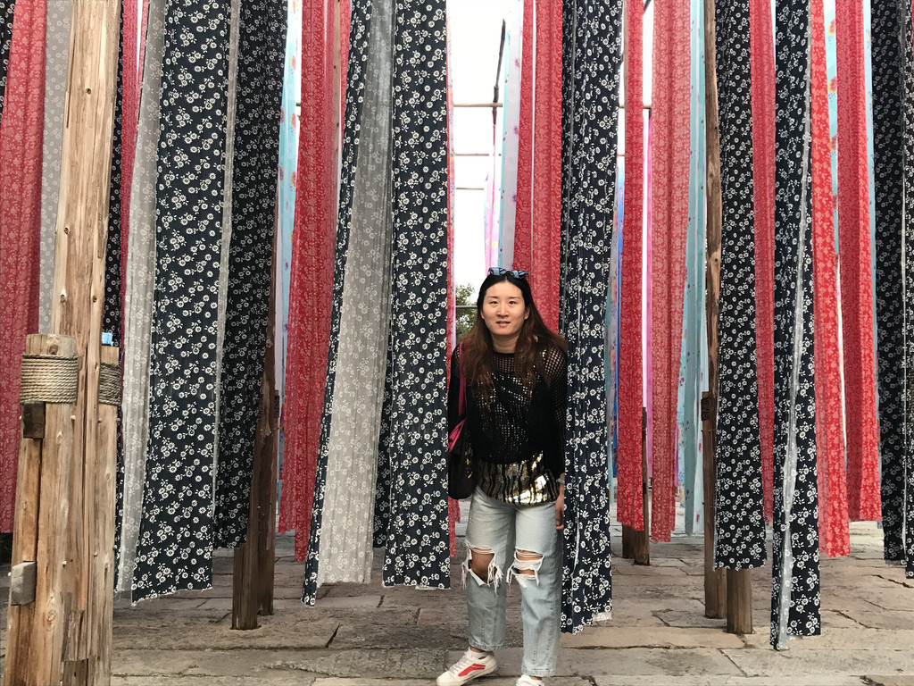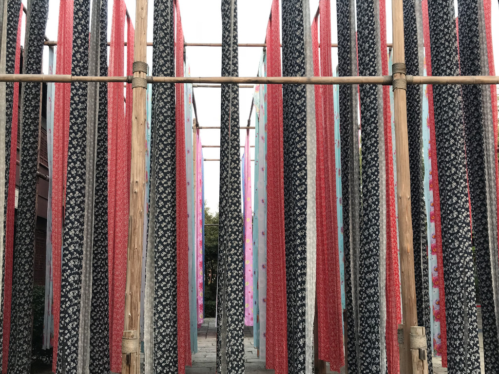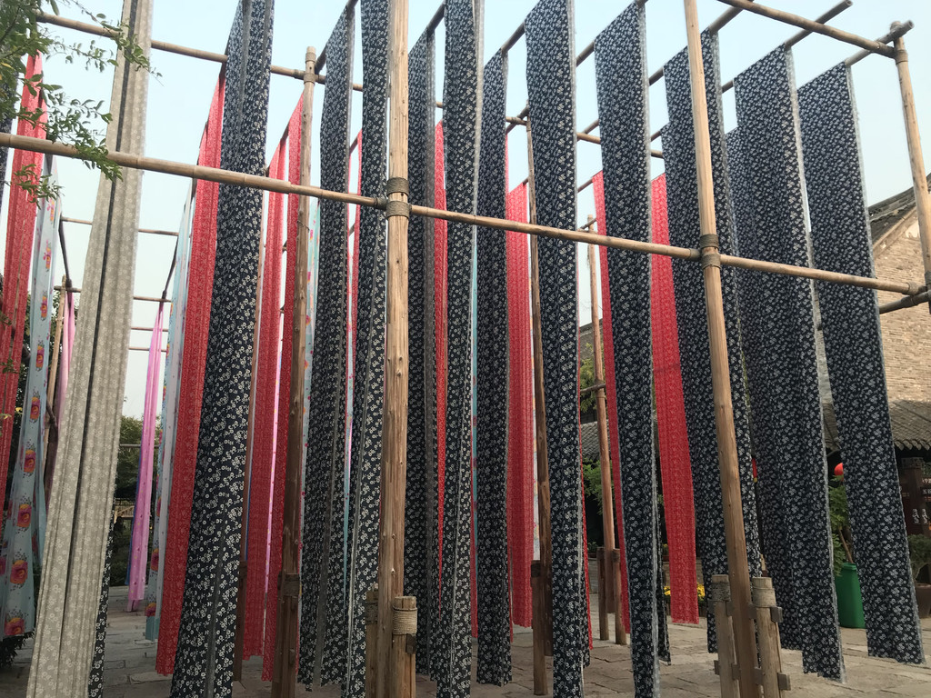 染布坊,高高垂下的兰花、红花长布,格外引人注目