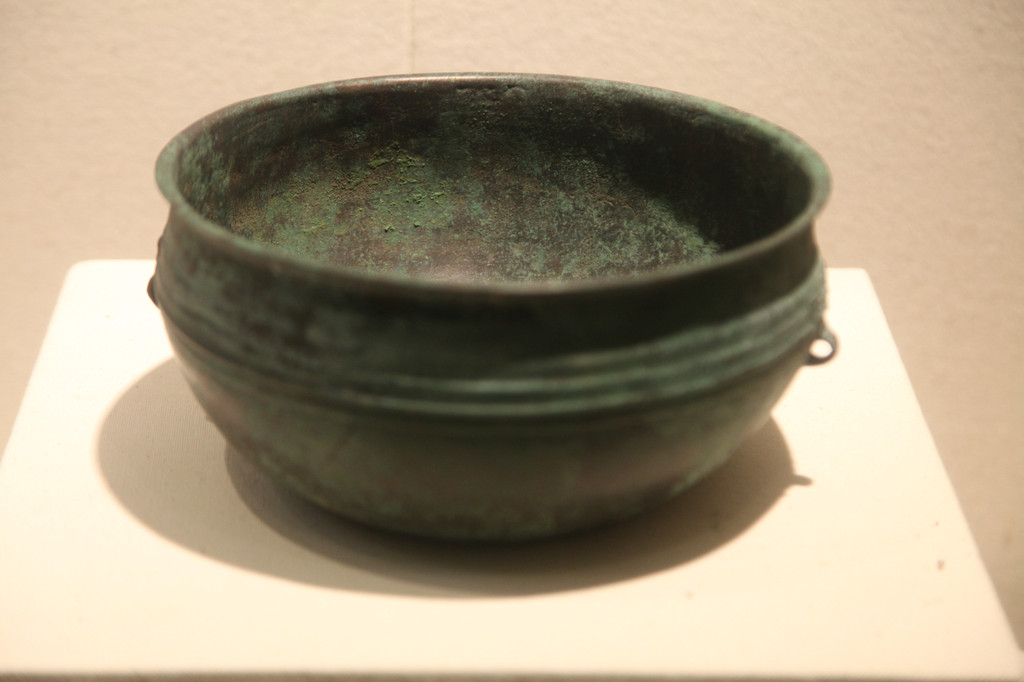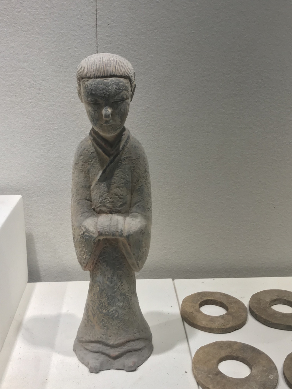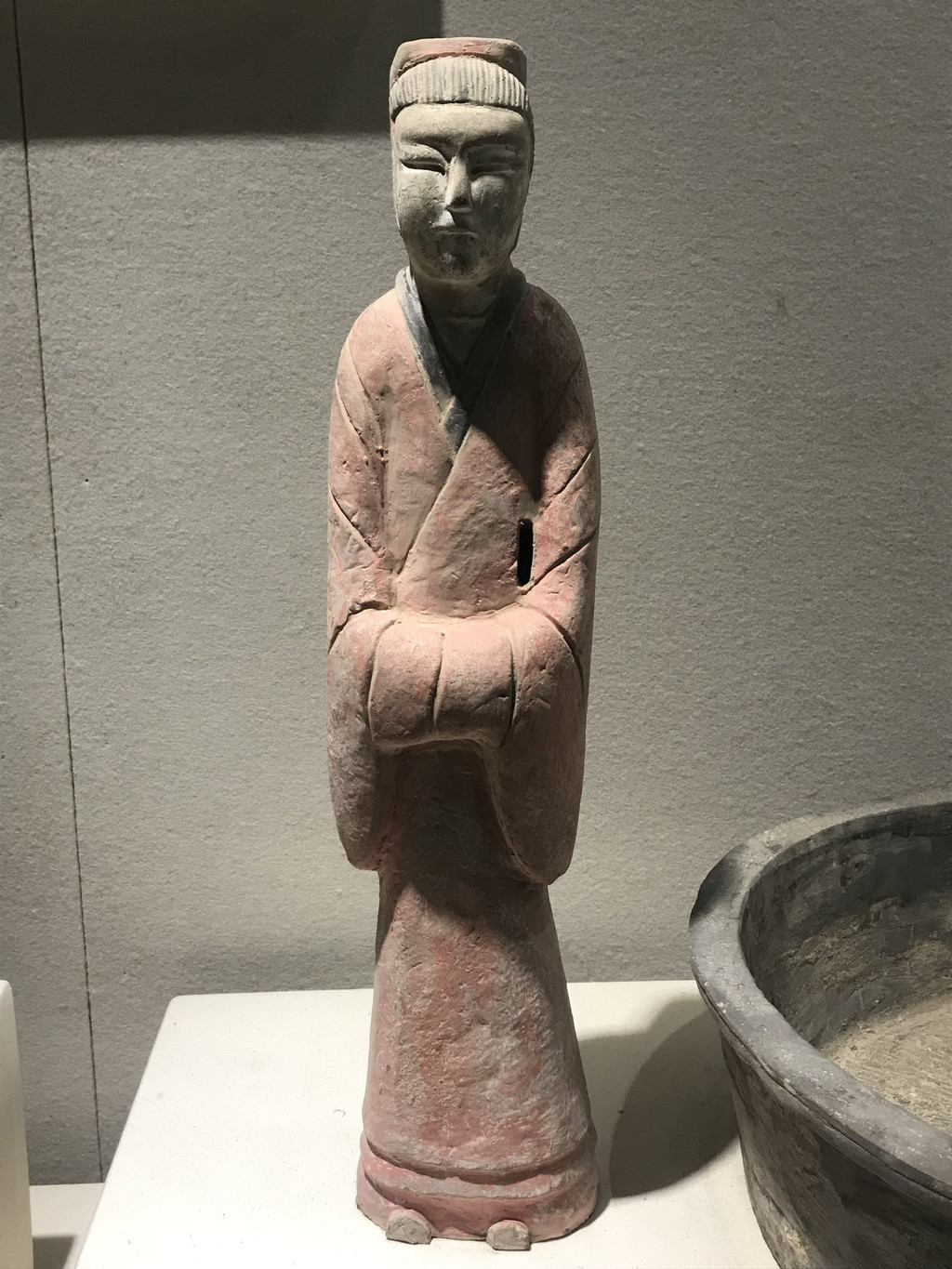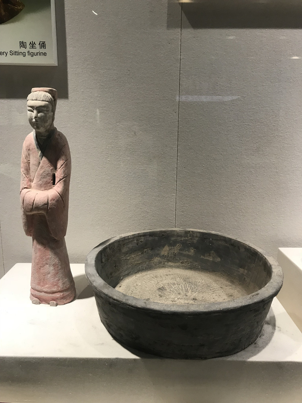 着汉代服饰的女子人物俑,身边大大的陶盆,是喂鸡鸭的,还是澡盆呢?