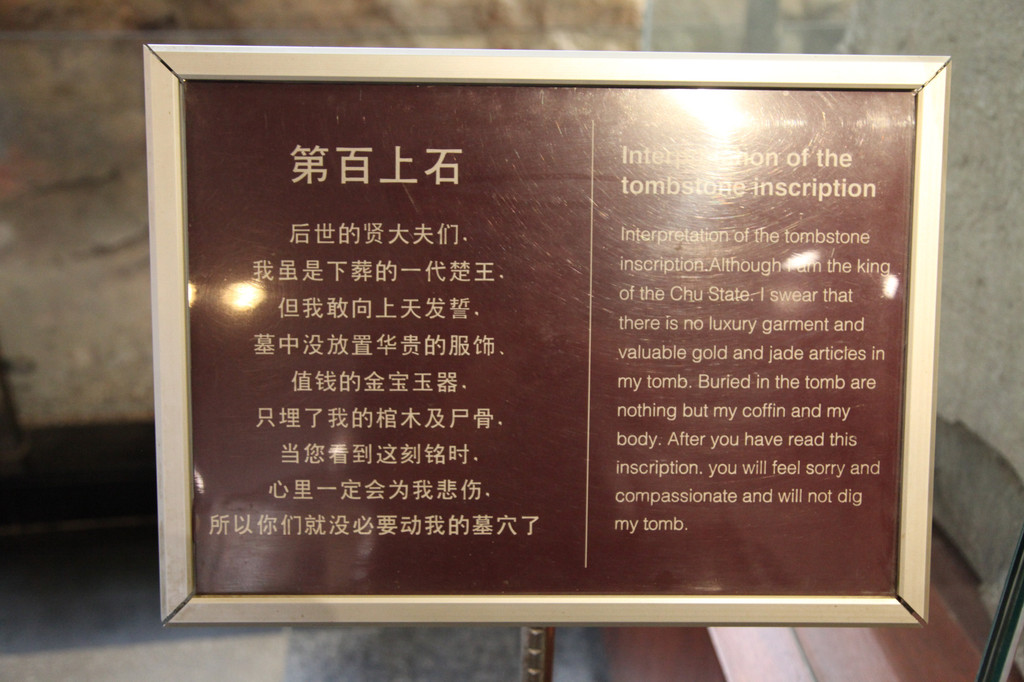 楚王特意在墓道门口立的告介令,告诫盗贼:墓里没有珠宝和金银玉器,意图打消盗墓贼的贪念
