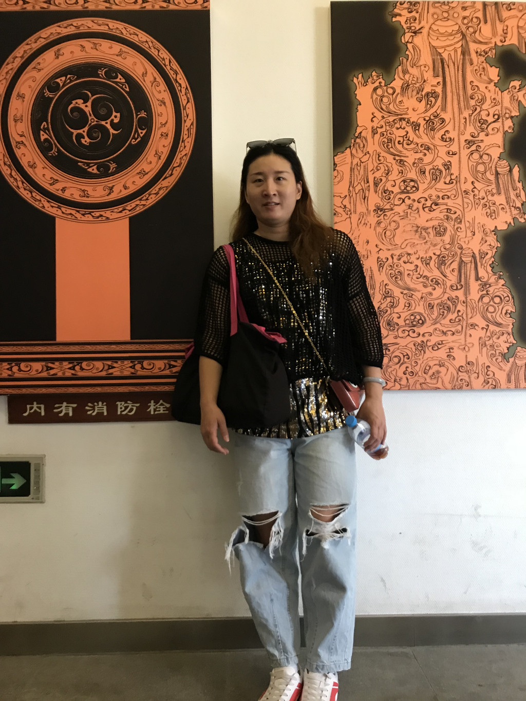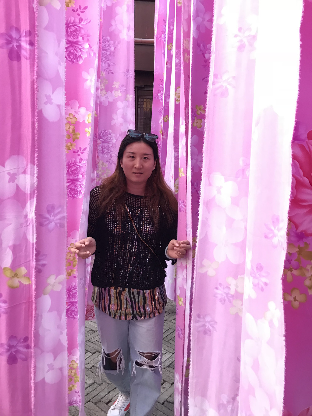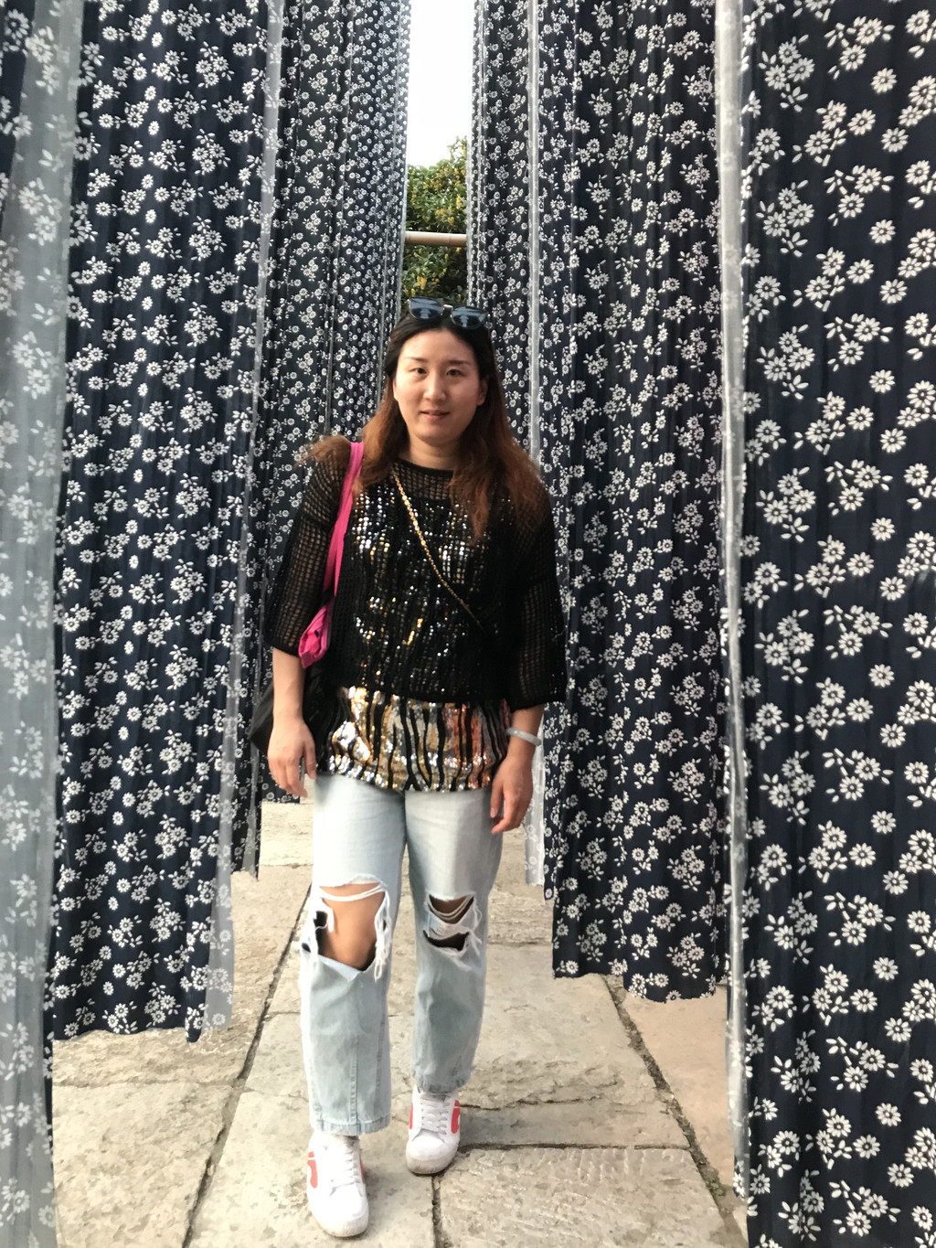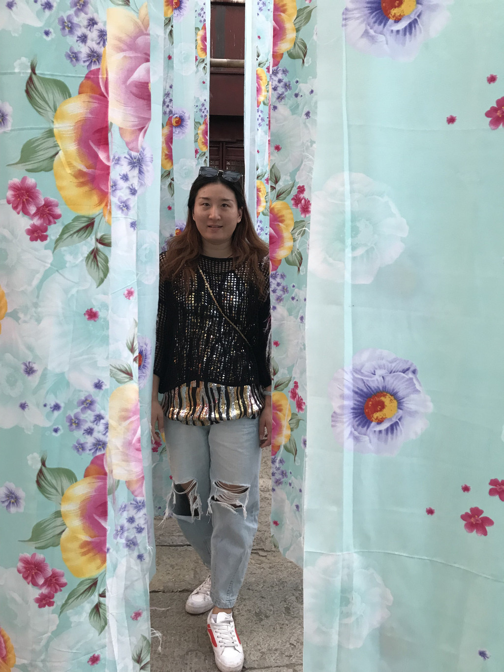 浅蓝色的布衣,图案花团锦簇,青春靓丽,富有朝气