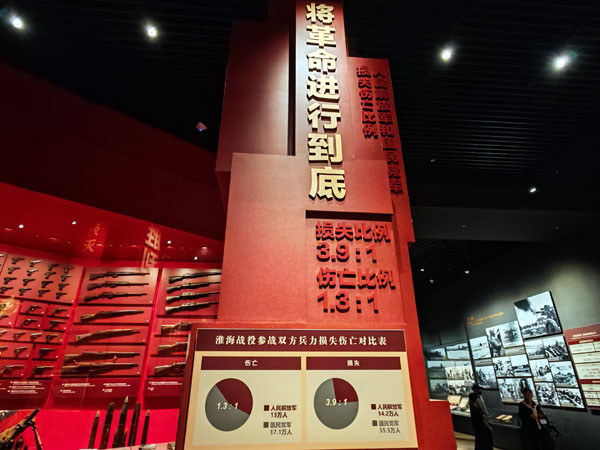 纪念馆内以“人民的胜利”为主题,设序厅、传承厅和“两种前途 命运决战”“逐鹿淮海 决战决胜”“人民战争 深厚伟力”“革命英烈 永垂不朽”四部分内容,共展出珍贵照片1000余张、文物2066件,11个互动展项和14处场景。