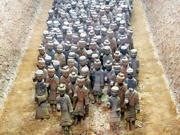 兵马俑坑计有东西向步兵俑坑3条、南北向警卫俑坑1条、骑兵和战车坑2条。目前已发掘两条步兵俑坑和警卫俑坑,现存陶俑2393件,皆为陶土烧制,是西汉楚国第三代楚王刘戊的陪葬品。