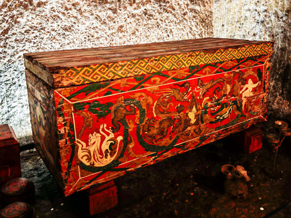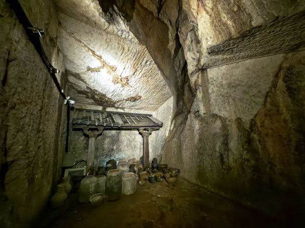 穿甬道入主墓室,空间骤然开阔。正中墓室高约三米,四壁凿有耳室,分别为庖厨、兵器库、粮仓之属。庖厨室墙角,仍存当年放置炊具的石槽;兵器库石壁上,还留着固定戈矛的石孔。