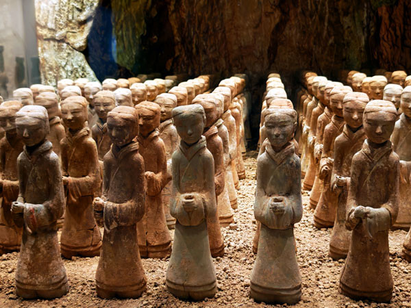 而汉兵马俑,作为狮子山楚王陵的重要组成部分,位于狮子山西麓,共发现有步兵俑坑四条,骑兵俑、车马坑各一条,出土陶俑数量多达4000余件。这些兵马俑种类繁杂,有官员俑、卫士俑、发辫俑等十余种,虽较秦陵兵俑稍小,但阵容肃整,形象威武刚毅。这些,我们在汉兵马俑博物馆都已经观赏过其震撼的规模。
