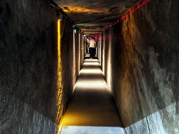 进入景区,首先见到的山门所题“龟山汉墓”四个大字,笔力沉厚如墓中夯土。入内后进入甬道,两侧石壁平直如削,灯光下竟无半分凿痕。而两条56米的甬道,平行误差仅5毫米的景观清晰映入人们的视野。此时,讲解员的声音在狭长通道里轻声说到:这个相当于从这里到北京,偏差不过一米。