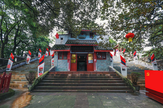 蒙顶山之颠,毅立着红军百丈关战役纪念馆,馆外古木苍松,茶园青翠欲滴,馆内陈列了战事文献资料,以及战争时期的一些器物。