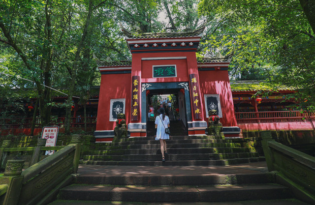 坐完索道才算真正到达蒙顶山上,进门处便是供奉着茶祖吴理真的天盖寺,寺前千年银杏环绕,那万绿丛中一抹红的色彩,显眼怀古,别有一番风味,此刻间山风徐来,带着淡淡的茶清香扑鼻,让人沉浸在醉人的味道之中。