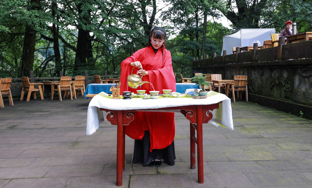 蒙顶山独有茶技:长嘴壶茶技“龙行十八式”是蒙顶山独有的掺茶技艺,堪称一绝。