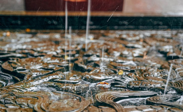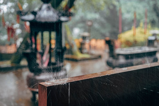 雨水在茶祖殿的屋檐前滴落。