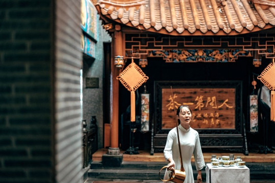 在茶楼不大的茶厅中央翩翩起舞。