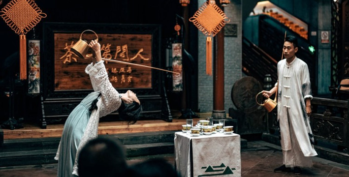开始不知其详,等茶壶从传人身体环绕一圈,用各式各样的姿势将茶倒入茶杯中,才惊叹技艺之奥妙!