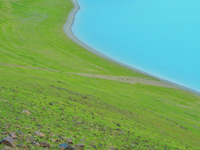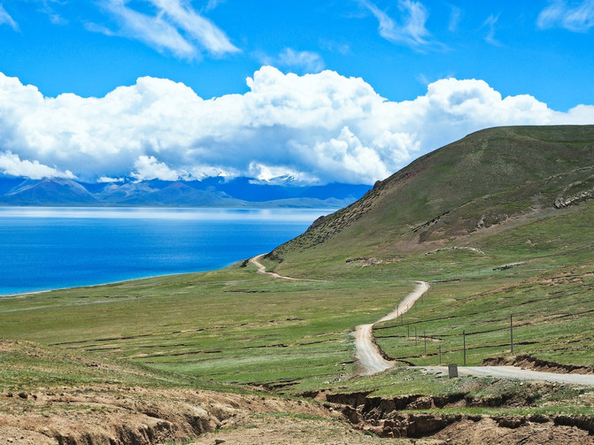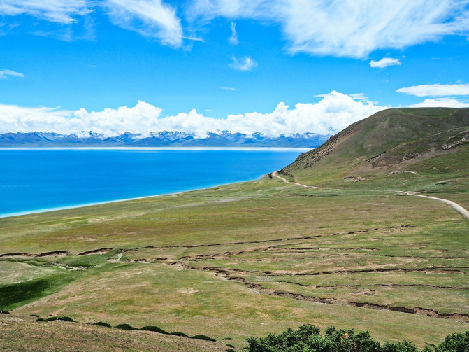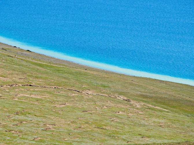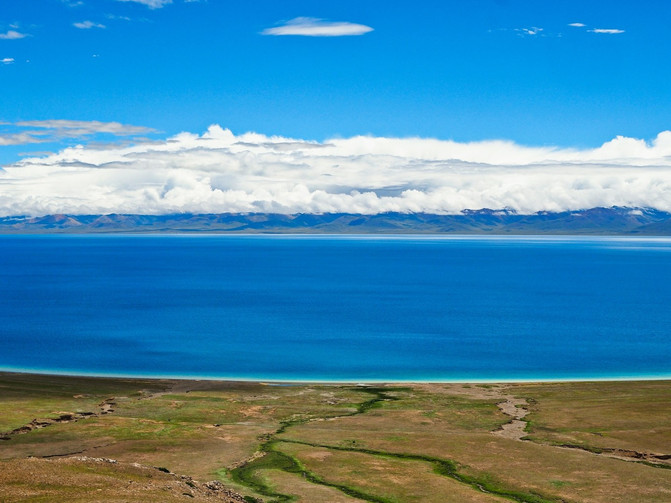 湖畔有着一块块盐白色的沼泽地,沼泽地边又有树根状的小沟渠,沟渠两旁顽强的植被,正肆意生长,给这贫瘠的土地上,增添了一丝生机。这斑驳成画的沼泽与翡翠的湖水,组成了一片美丽的“海滩”。难怪,人们常说 西藏 人从不看海,只因家门口的措太美了,胜过那蓝天碧海。