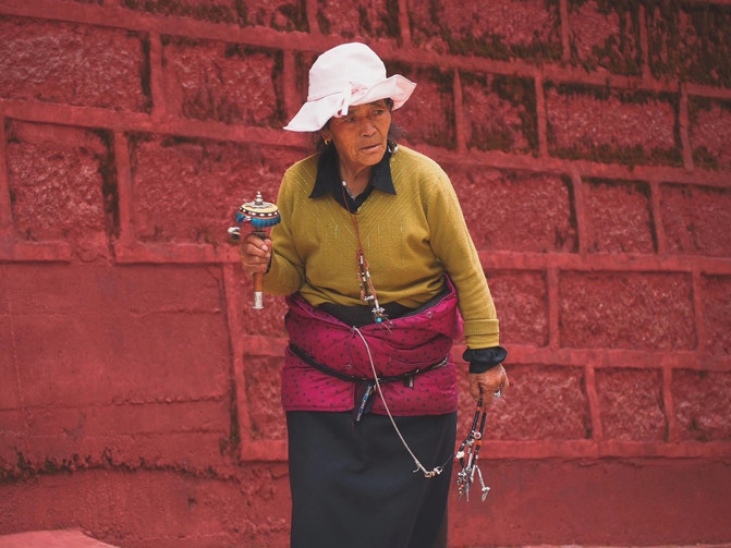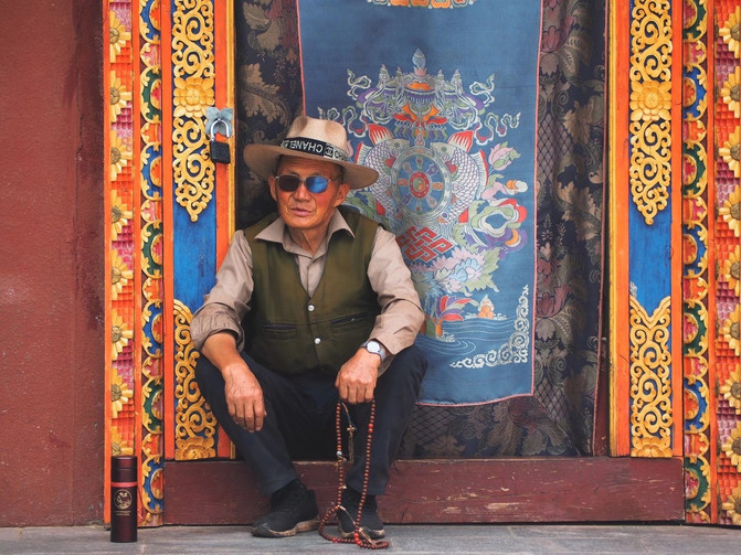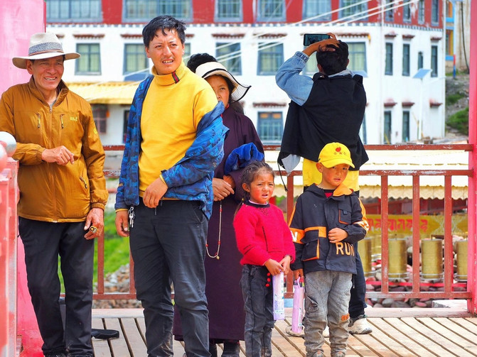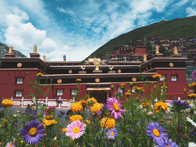 站在孜珠寺对面的观景平台上近赏孜珠寺,朱红色的宫殿被星罗棋布的屋舍环顾四周,而屋舍之后就是那如同六叶莲花瓣的孜珠山六峰,层层叠叠的庇护佑下,这座神圣的宫殿传来阵阵梵音,熙熙攘攘的喇嘛席地而坐,手里的转经筒更迭不息地转动着。