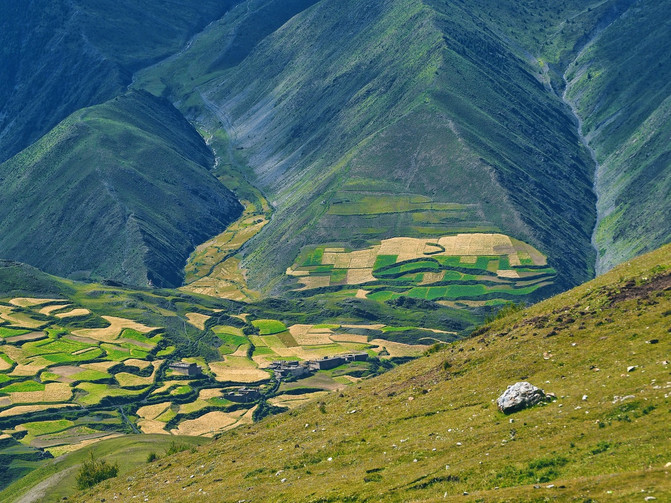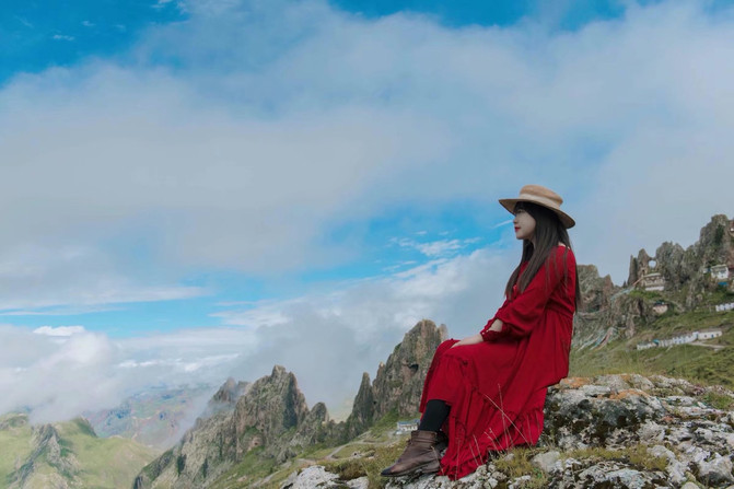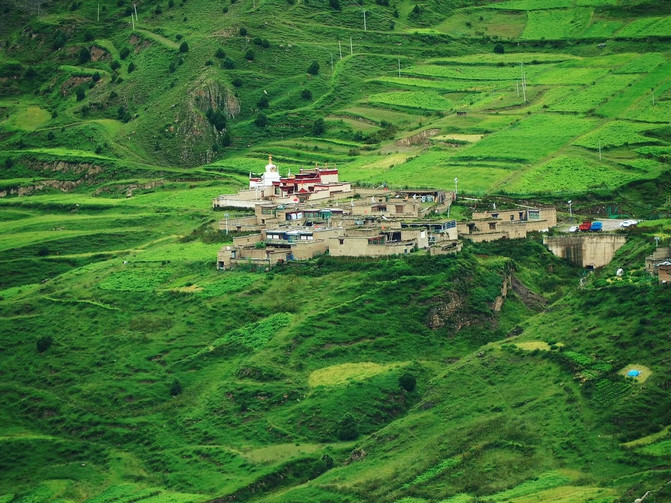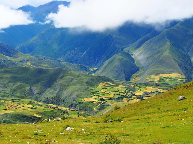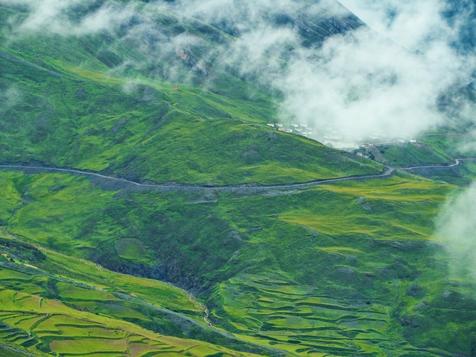 在六峰之侧的另一边,有一座小孤寂的小山峰。山峰的后面是不测之渊,沿着悬崖边的草地一直前行,可以将远处如诗如画的小山村,静谧之景,尽收眼底。在云雾的深处,一座藏家村寨,青稞田层层叠叠,镶嵌在山水间,烟火正浓,与世无争。