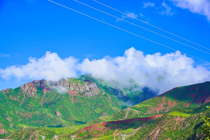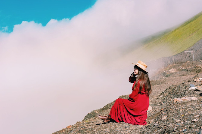 沿着错落有致的玛尼堆,向远处望去,云雾缭绕下的褐色山峦中,皑皑雪山渐露尖角,像是那害羞的姑娘,轻轻的拨开了薄纱,打望着对岸的人群。周遭静寂无声,时光仿佛停滞了,这片如诗如画的美景,让人的心扉也变得美妙起来。