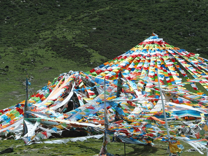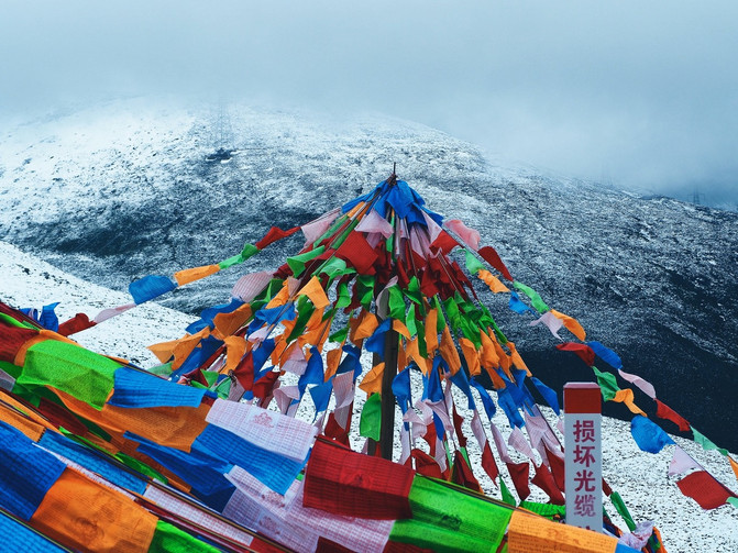 时隔一年,再次来到折多山,竟然变了个样。垂直向上的观景台台阶两侧围栏上,多一些经幡。当地还特意维修了一个经幡祈福地,供游客在折多山上寄托祝福。