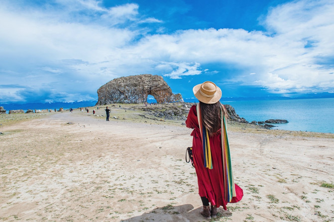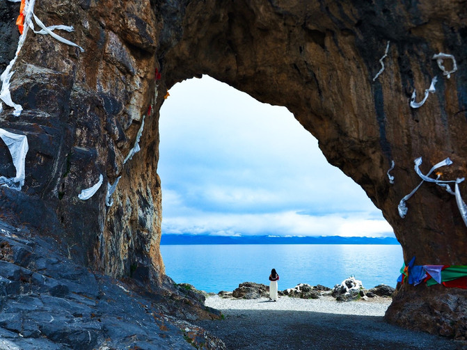 苍穹之下,天湖一色,经幡猎猎。碧湖之侧,怪石罗列,雪山绵延。一撇惊鸿,再见倾心……一座形如巨象的圣石,屹立在 纳木错 北岸。而石象中的天门大开,像是在窥探 纳木错 。圣洁的雪山、纯净的湖水、奇特的圣石,构成了天地间最唯美的画面,每一帧都令人难以忘却。