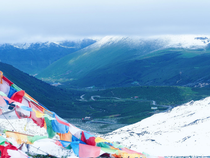 折多山最高峰海拔4962米,垭口海拔4298米,与 康定 市的海拔落差达1800米。沿着蜿蜒盘旋的公路驱车驶入折多山垭口,立秋之际, 成都 燥热不堪,折多山却寒风凌凌,还下起了大雪,大伙都纷纷换上了冬装。