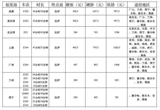 1.火车: 成都 、 重庆 、 兰州 、 西宁 、 北京 、 上海 、 广州 ,有火车直达 拉萨 。