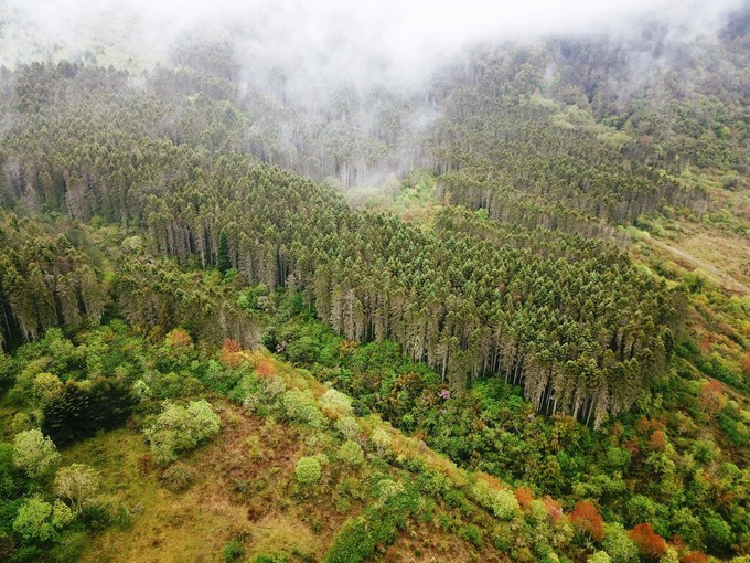 这些树有的高四五米,有的高十多米。它们姿态万千,有的枝干遒劲,昂首挺胸,犹如英姿飒爽的将士;有的虬枝峥嵘,张牙舞爪,犹如狰狞的怪物;有的盘根错节,虬枝横卧,犹如蛟龙出海;有的你缠我绕,相牵相携,犹如缠绵的恋人。那些纵横交错的枝干附生着蕨、地衣、苔藓、杜鹃、松萝等植物,构成了微缩的立体景观。有的树干倒地数十年而不腐,陆陆续续又萌发出一些嫩芽,迸发了生命的第二春。